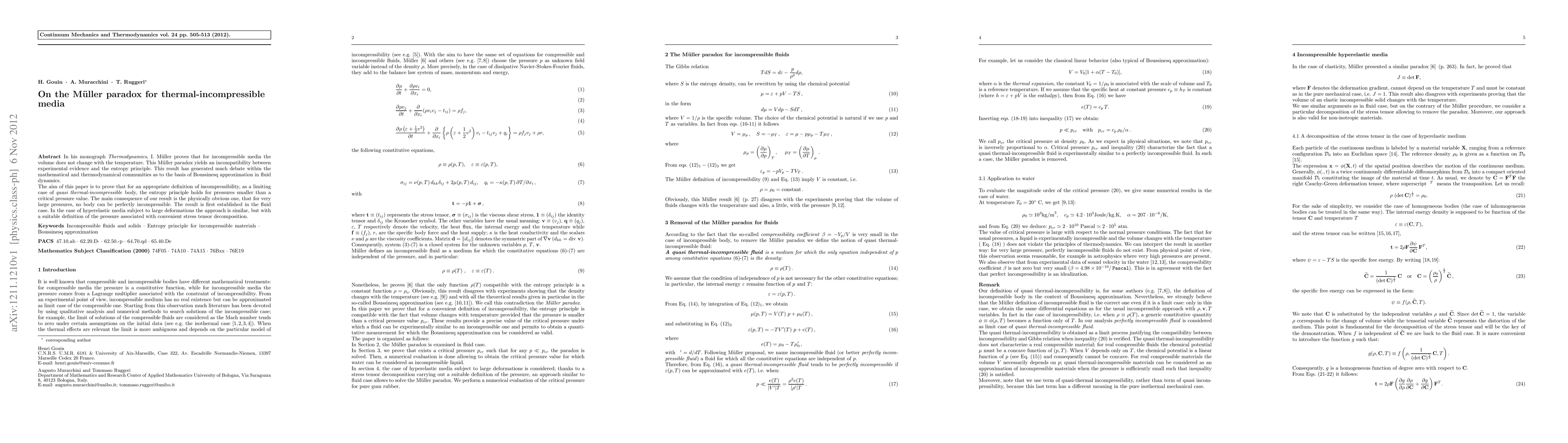 This paper resolves the Müller paradox, showing that for a specific definition of incompressibility in thermal-incompressible media, the entropy principle holds true for pressures below a critical threshold. The findings suggest that perfect incompressibility is unattainable for extremely high pressures, both in fluids and in hyperelastic materials undergoing large deformations.