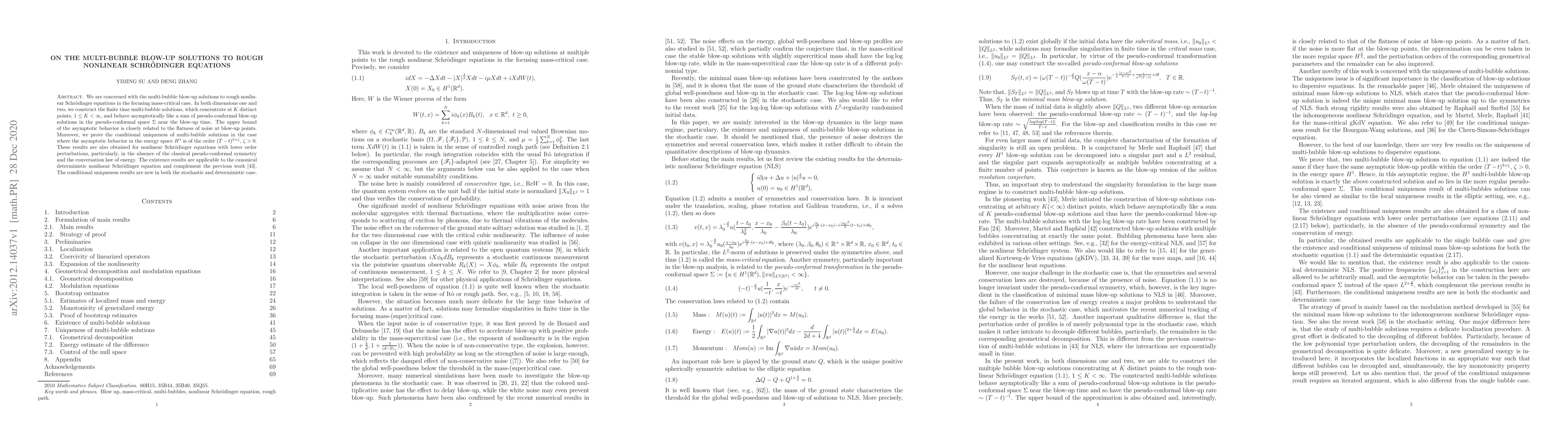 We are concerned with the multi-bubble blow-up solutions to rough nonlinear Schr\"odinger equations in the focusing mass-critical case. In both dimensions one and two, we construct the finite time multi-bubble solutions, which concentrate at $K$ distinct points, $1\leq K<\infty$, and behave asymptotically like a sum of pseudo-conformal blow-up solutions in the pseudo-conformal space $\Sigma$ near the blow-up time. The upper bound of the asymptotic behavior is closely related to the flatness of noise at blow-up points. Moreover, we prove the conditional uniqueness of multi-bubble solutions in the case where the asymptotic behavior in the energy space $H^1$ is of the order $(T-t)^{3+\zeta}$, $\zeta>0$. These results are also obtained for nonlinear Schr\"odinger equations with lower order perturbations, particularly, in the absence of the classical pseudo-conformal symmetry and the conversation law of energy. The existence results are applicable to the canonical deterministic nonlinear Schr\"odinger equation and complement the previous work [43]. The conditional uniqueness results are new in both the stochastic and deterministic case.