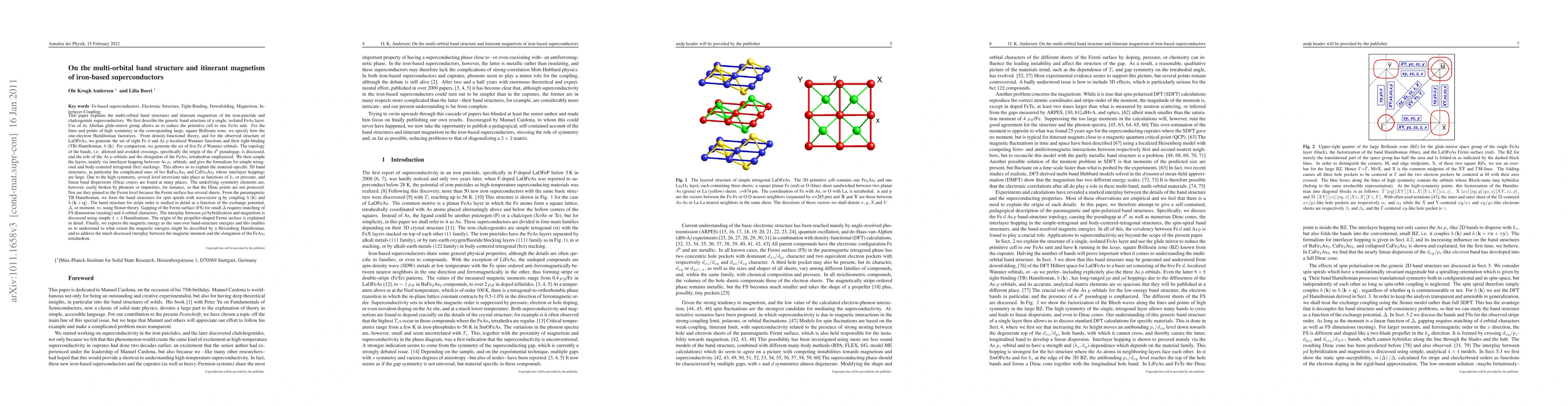 This paper explains the multi-orbital band structures and itinerant magnetism of the iron-pnictide and chalcogenides. We first describe the generic band structure of an isolated FeAs layer. Use of its Abelian glide-mirror group allows us to reduce the primitive cell to one FeAs unit. From density-functional theory, we generate the set of eight Fe $d$ and As $p$ localized Wannier functions for LaOFeAs and their tight-binding (TB) Hamiltonian, $h(k)$. We discuss the topology of the bands, i.e. allowed and avoided crossings, the origin of the d6 pseudogap, as well as the role of the As $p$ orbitals and the elongation of the FeAs$_{4}$ tetrahedron. We then couple the layers, mainly via interlayer hopping between As $p_{z}$ orbitals, and give the formalism for simple and body-centered tetragonal stackings. This allows us to explain the material-specific 3D band structures. Due to the high symmetry, several level inversions take place as functions of $k_{z}$ or pressure, resulting in linear band dispersions (Dirac cones). The underlying symmetry elements are, however, easily broken, so that the Dirac points are not protected, nor pinned to the Fermi level. From the paramagnetic TB Hamiltonian, we form the band structures for spin spirals with wavevector $q$ by coupling $h(k)$ and $h (k+q)$. The band structure for stripe order is studied as a function of the exchange potential, $\Delta$, using Stoner theory. Gapping of the Fermi surface (FS) for small $\Delta $ requires matching of FS dimensions (nesting) and $d$-orbital characters. The origin of the propeller-shaped FS is explained. Finally, we express the magnetic energy as the sum over band-structure energies, which enables us to understand to what extent the magnetic energies might be described by a Heisenberg Hamiltonian, and the interplay between the magnetic moment and the elongation of the FeAs4 tetrahedron.