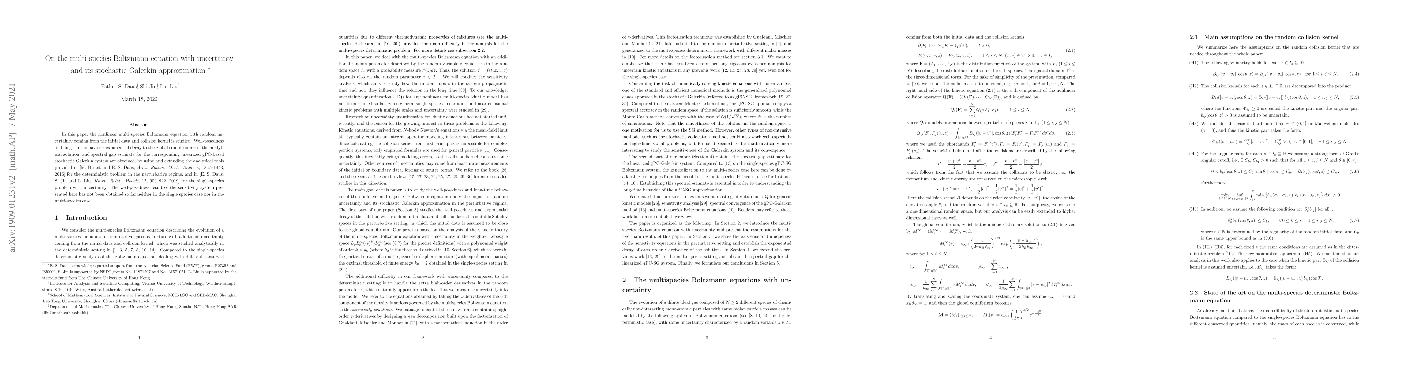 This paper investigates the multi-species Boltzmann equation with random uncertainties, proving well-posedness and exponential decay to equilibrium. It also introduces a stochastic Galerkin approximation, extending analytical tools for the deterministic and single-species cases to handle uncertainty.