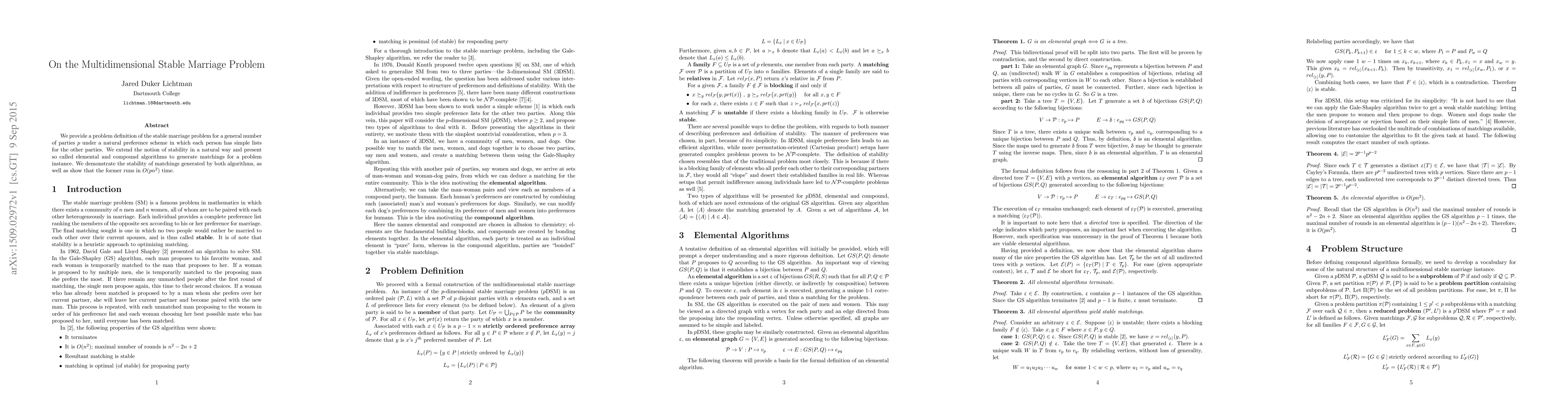 This paper defines the multidimensional stable marriage problem for $p$ parties and introduces algorithms to generate stable matchings. It demonstrates the stability of the matchings and shows that one algorithm operates in $O(pn^2)$ time.
