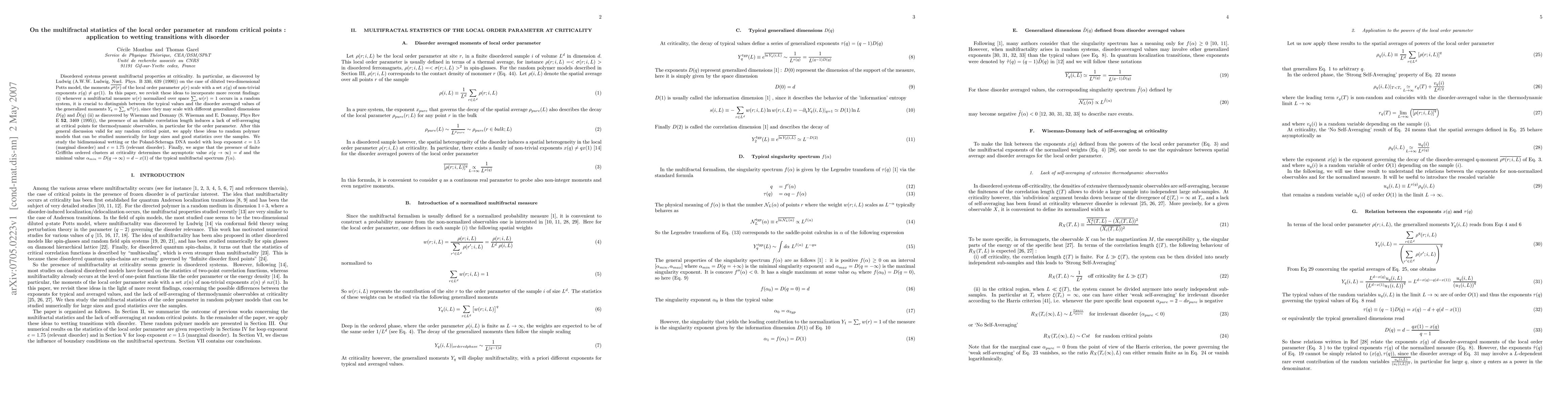 Disordered systems present multifractal properties at criticality. In particular, as discovered by Ludwig (A.W.W. Ludwig, Nucl. Phys. B 330, 639 (1990)) on the case of diluted two-dimensional Potts model, the moments $\bar{\rho^q(r)}$ of the local order parameter $\rho(r)$ scale with a set $x(q)$ of non-trivial exponents $x(q) \neq q x(1)$. In this paper, we revisit these ideas to incorporate more recent findings: (i) whenever a multifractal measure $w(r)$ normalized over space $ \sum_r w(r)=1$ occurs in a random system, it is crucial to distinguish between the typical values and the disorder averaged values of the generalized moments $Y_q =\sum_r w^q(r)$, since they may scale with different generalized dimensions $D(q)$ and $\tilde D(q)$ (ii) as discovered by Wiseman and Domany (S. Wiseman and E. Domany, Phys Rev E {\bf 52}, 3469 (1995)), the presence of an infinite correlation length induces a lack of self-averaging at critical points for thermodynamic observables, in particular for the order parameter. After this general discussion valid for any random critical point, we apply these ideas to random polymer models that can be studied numerically for large sizes and good statistics over the samples. We study the bidimensional wetting or the Poland-Scheraga DNA model with loop exponent $c=1.5$ (marginal disorder) and $c=1.75$ (relevant disorder). Finally, we argue that the presence of finite Griffiths ordered clusters at criticality determines the asymptotic value $x(q \to \infty) =d$ and the minimal value $ \alpha_{min}=D(q \to \infty)=d-x(1) $ of the typical multifractal spectrum $f(\alpha)$.