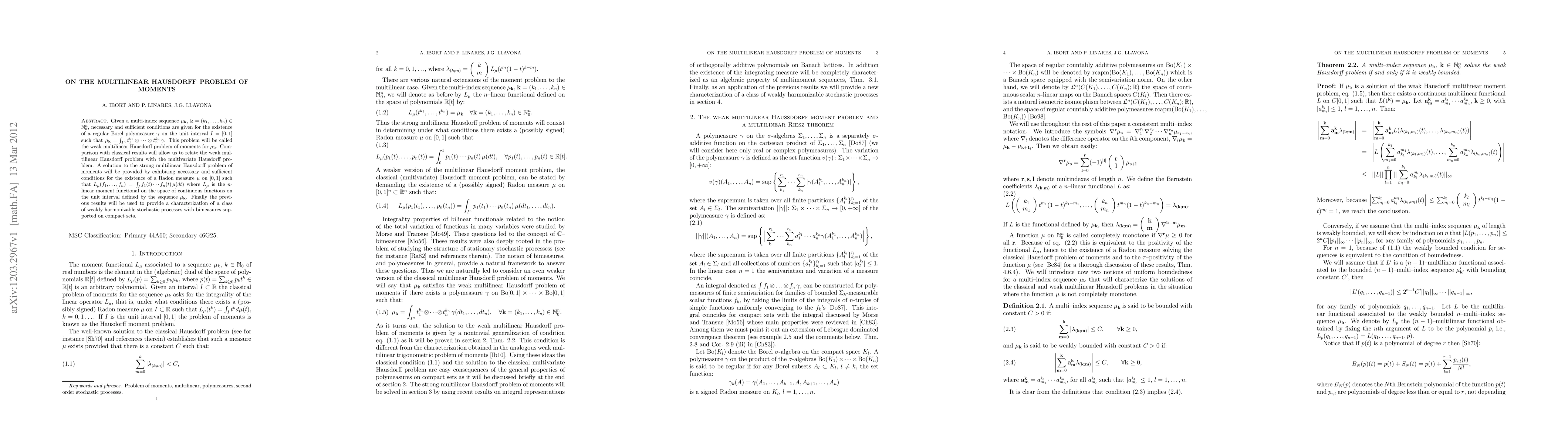 Given a multi-index sequence $\mu_{\mathbf{k}}$, $\mathbf{k} = (k_1,..., k_n) \in \mathbb{N}_0^n$, necessary and sufficient conditions are given for the existence of a regular Borel polymeasure $\gamma$ on the unit interval $I= [0,1]$ such that $\mu_{\mathbf{k}} = \int_{I^n} t_1^{k_1}\otimes ... \otimes t_n^{k_n} \gamma$. This problem will be called the weak multilinear Hausdorff problem of moments for $\mu_{\mathbf{k}}$. Comparison with classical results will allow us to relate the weak multilinear Hausdorff problem with the multivariate Hausdorff problem. A solution to the strong multilinear Hausdorff problem of moments will be provided by exhibiting necessary and sufficient conditions for the existence of a Radon measure $\mu$ on $[0,1]$ such that $L_\mu(f_1,..., f_n) = \int_{I} f_1(t) ... f_n(t) \mu (dt)$ where $L_\mu$ is the $n$-linear moment functional on the space of continuous functions on the unit interval defined by the sequence $\mu_{\mathbf{k}}$. Finally the previous results will be used to provide a characterization of a class of weakly harmonizable stochastic processes with bimeasures supported on compact sets.