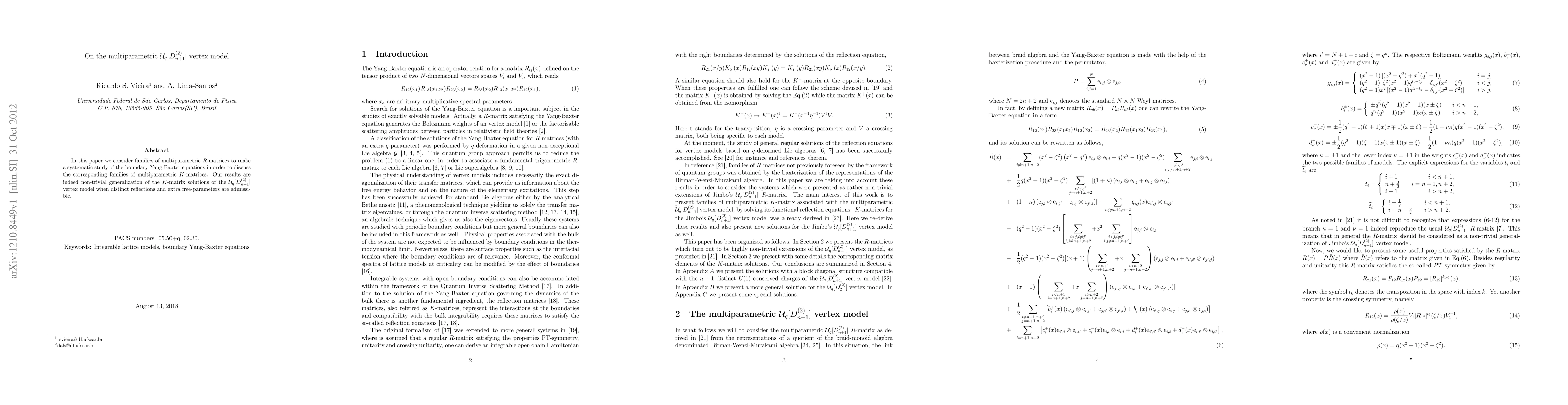 In this paper we consider families of multiparametric $R$-matrices to make a systematic study of the boundary Yang-Baxter equations in order to discuss the corresponding families of multiparametric $K$-matrices. Our results are indeed non-trivial generalization of the $K$-matrix solutions of the {\cal {U}}_{q}[D_{n+1}^{(2)}] vertex model when distinct reflections and extra free-parameters are admissible.