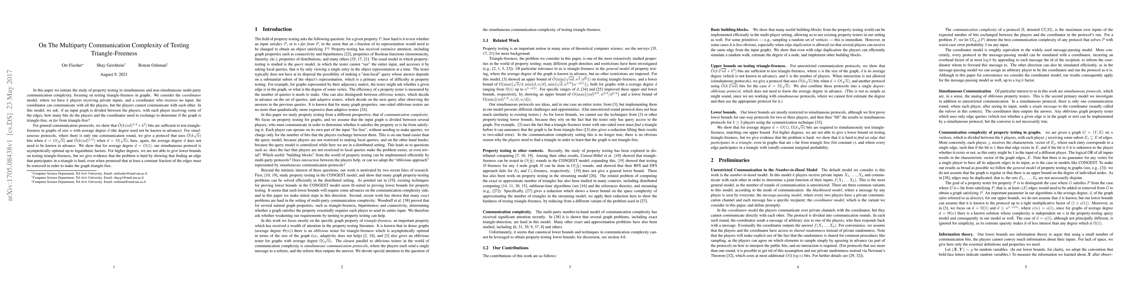 This paper explores multiparty communication complexity for testing triangle-freeness in graphs, focusing on the coordinator model. It presents protocols for both general and simultaneous communication, showing that $\tilde{O}(k(nd)^{1/4}+k^2)$ bits are sufficient for general protocols, and $\tilde{O}(k \sqrt{n})$ or $\tilde{O}(k (nd)^{1/3})$ bits for simultaneous protocols depending on the average degree $d$.