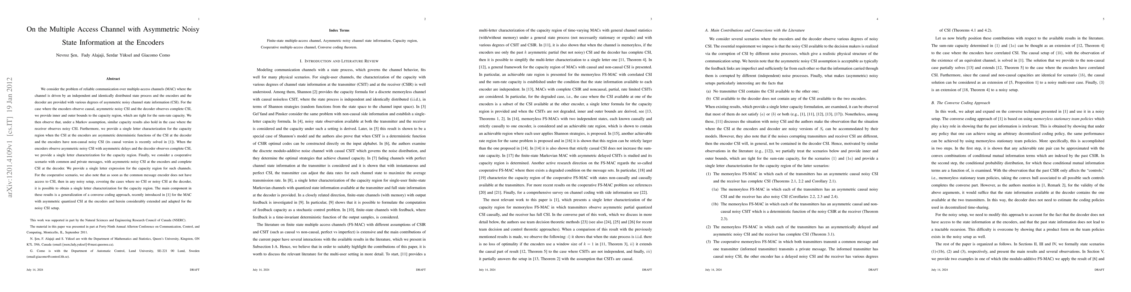 We consider the problem of reliable communication over multiple-access channels (MAC) where the channel is driven by an independent and identically distributed state process and the encoders and the decoder are provided with various degrees of asymmetric noisy channel state information (CSI). For the case where the encoders observe causal, asymmetric noisy CSI and the decoder observes complete CSI, we provide inner and outer bounds to the capacity region, which are tight for the sum-rate capacity. We then observe that, under a Markov assumption, similar capacity results also hold in the case where the receiver observes noisy CSI. Furthermore, we provide a single letter characterization for the capacity region when the CSI at the encoders are asymmetric deterministic functions of the CSI at the decoder and the encoders have non-causal noisy CSI (its causal version is recently solved in \cite{como-yuksel}). When the encoders observe asymmetric noisy CSI with asymmetric delays and the decoder observes complete CSI, we provide a single letter characterization for the capacity region. Finally, we consider a cooperative scenario with common and private messages, with asymmetric noisy CSI at the encoders and complete CSI at the decoder. We provide a single letter expression for the capacity region for such channels. For the cooperative scenario, we also note that as soon as the common message encoder does not have access to CSI, then in any noisy setup, covering the cases where no CSI or noisy CSI at the decoder, it is possible to obtain a single letter characterization for the capacity region. The main component in these results is a generalization of a converse coding approach, recently introduced in [1] for the MAC with asymmetric quantized CSI at the encoders and herein considerably extended and adapted for the noisy CSI setup.