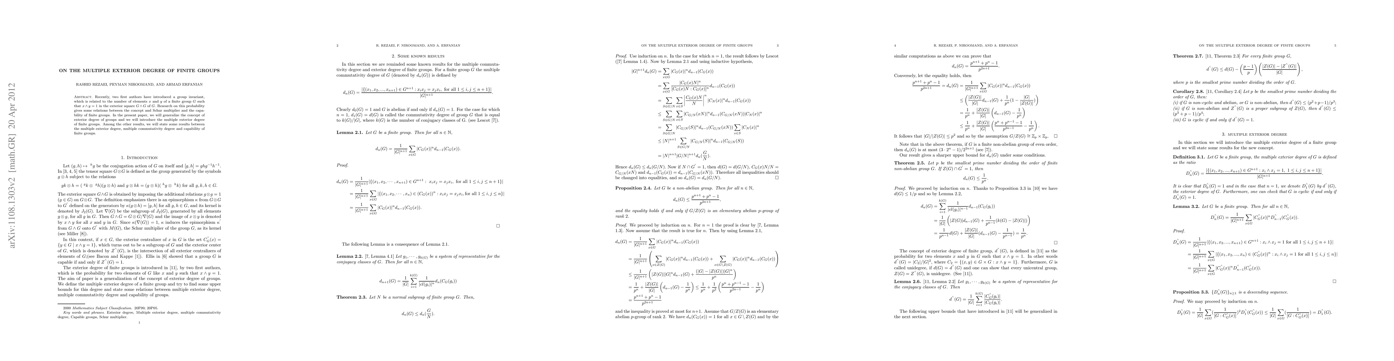 Recently, two first authors have introduced a group invariant, which is related to the number of elements $x$ and $y$ of a finite group $G$ such that $x\wedge y=1$ in the exterior square $G\wedge G$ of $G$. Research on this probability gives some relations between the concept and Schur multiplier and the capability of finite groups. In the present paper, we will generalize the concept of exterior degree of groups and we will introduce the multiple exterior degree of finite groups. Among the other results, we will state some results between the multiple exterior degree, multiple commutativity degree and capability of finite groups.