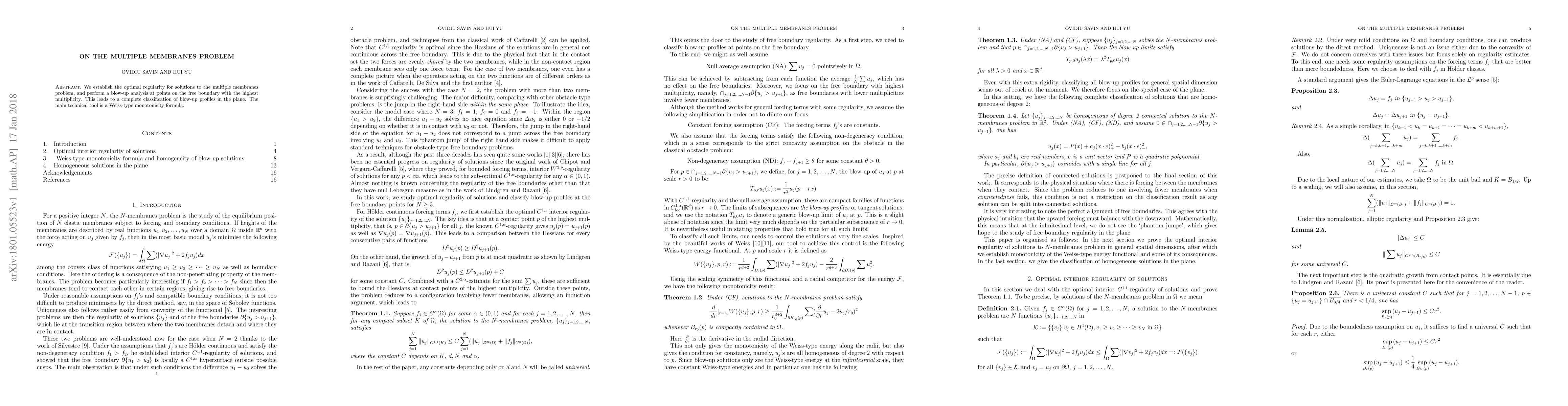 We establish the optimal regularity for solutions to the multiple membranes problem, and perform a blow-up analysis at points on the free boundary with the highest multiplicity. This leads to a complete classification of blow-up profiles in the plane. The main technical tool is a Weiss-type monotonicity formula.