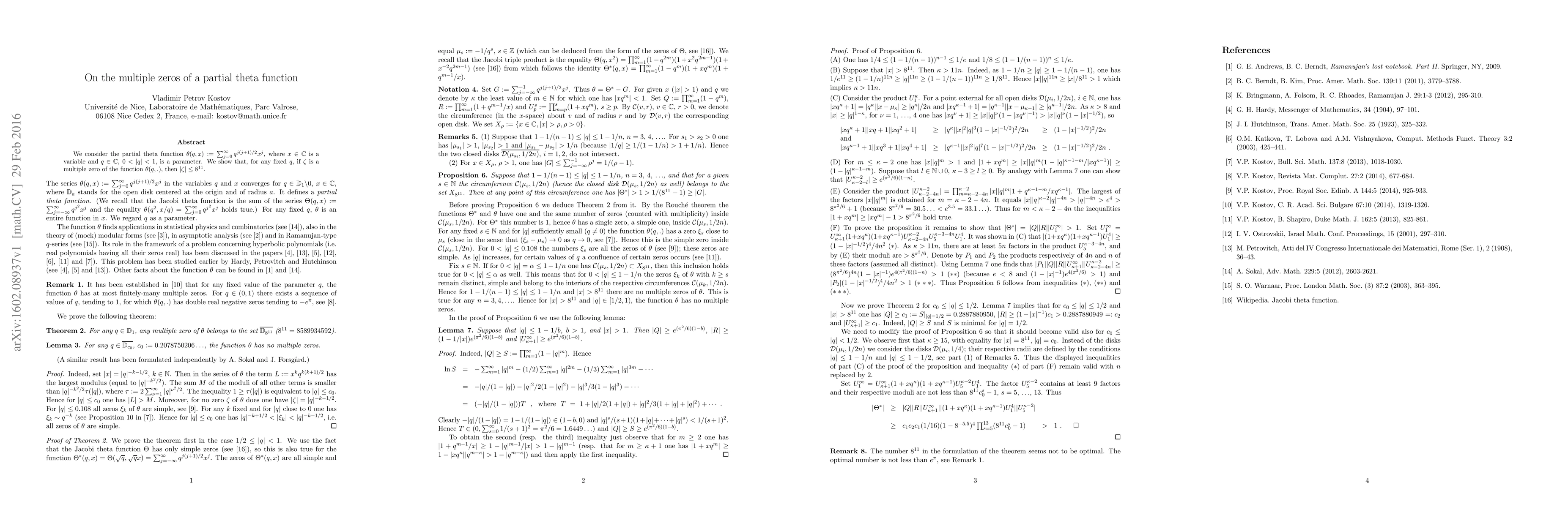 Summary: This paper investigates the partial theta function $\theta(q,x)$ and proves that any multiple zero $\zeta$ of this function, for a fixed $q$ with $0<|q|<1$, satisfies the inequality $|\zeta |\leq 8^{11}$. The result provides a bound on the magnitude of multiple zeros for this specific function.