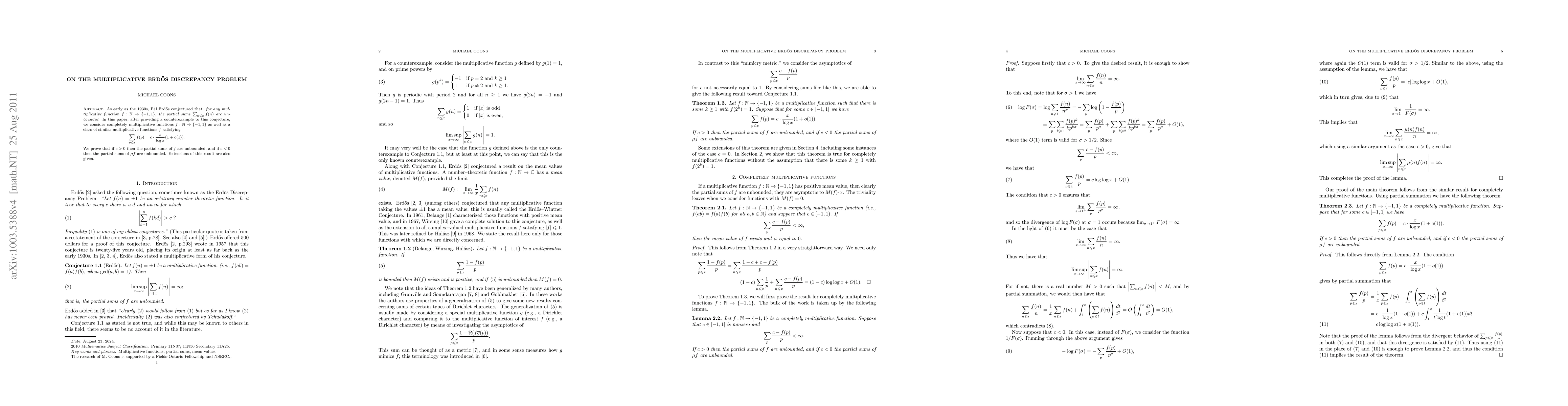 As early as the 1930s, P\'al Erd\H{o}s conjectured that: {\em for any multiplicative function $f:\mathbb{N}\to\{-1,1\}$, the partial sums $\sum_{n\leq x}f(n)$ are unbounded.} Considering this conjecture, in this paper we consider multiplicative functions $f$ satisfying $$\sum_{p\leq x}f(p)=c\cdot\frac{x}{\log x}(1+o(1)).$$ We prove that if $c>0$ then the partial sums of $f$ are unbounded, and if $c<0$ then the partial sums of $\mu f$ are unbounded. Extensions of this result are also discussed.