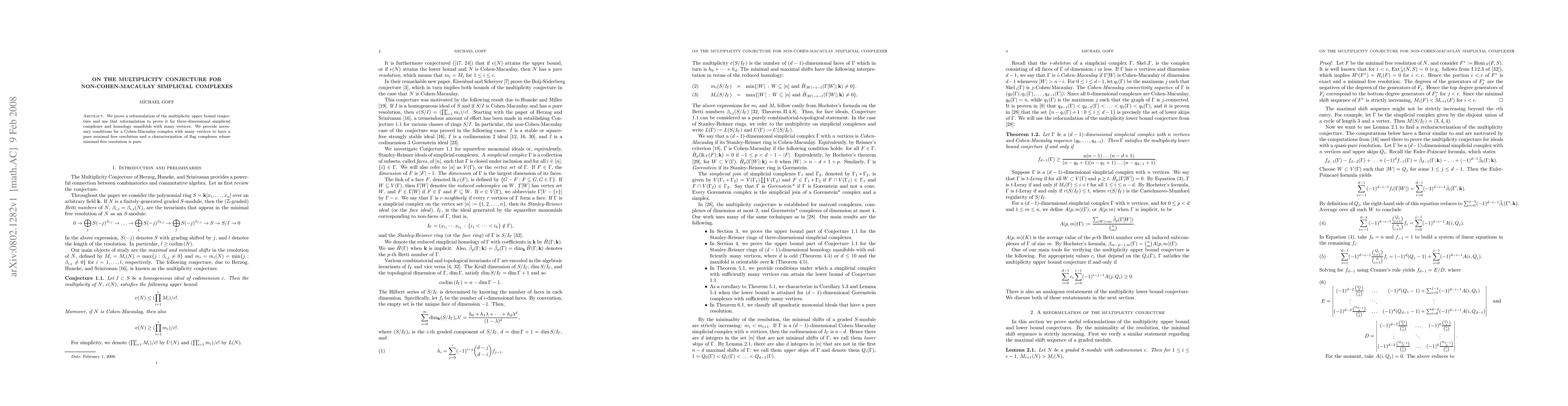 We prove a reformulation of the multiplicity upper bound conjecture and use that reformulation to prove it for three-dimensional simplicial complexes and homology manifolds with many vertices. We provide necessary conditions for a Cohen-Macaulay complex with many vertices to have a pure minimal free resolution and a characterization of flag complexes whose minimal free resolution is pure.