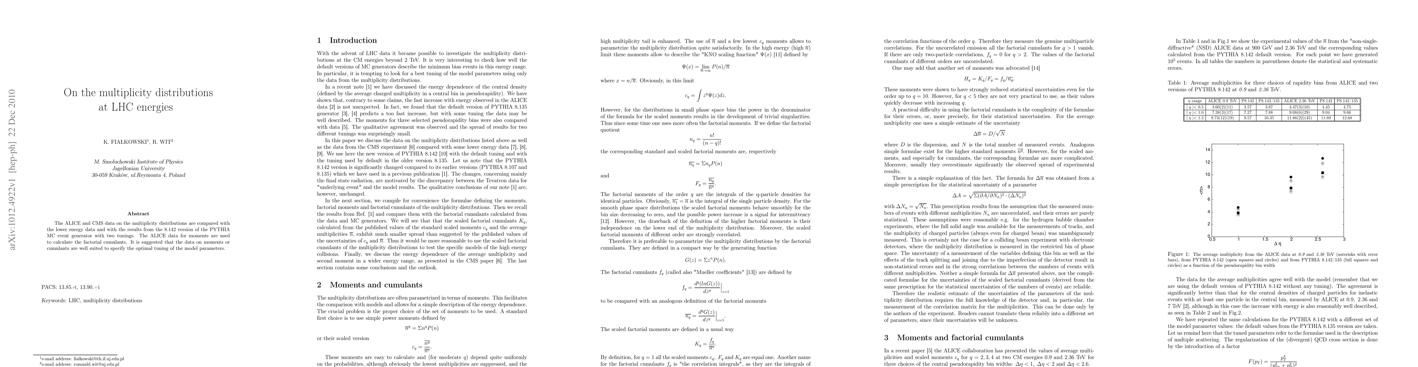 The ALICE and CMS data on the multiplicity distributions are compared with the lower energy data and with the results from the 8.142 version of the PYTHIA MC event generator with two tunings. The ALICE data for moments are used to calculate the factorial cumulants. It is suggested that the data on moments or cumulants are well suited to specify the optimal tuning of the model parameters.