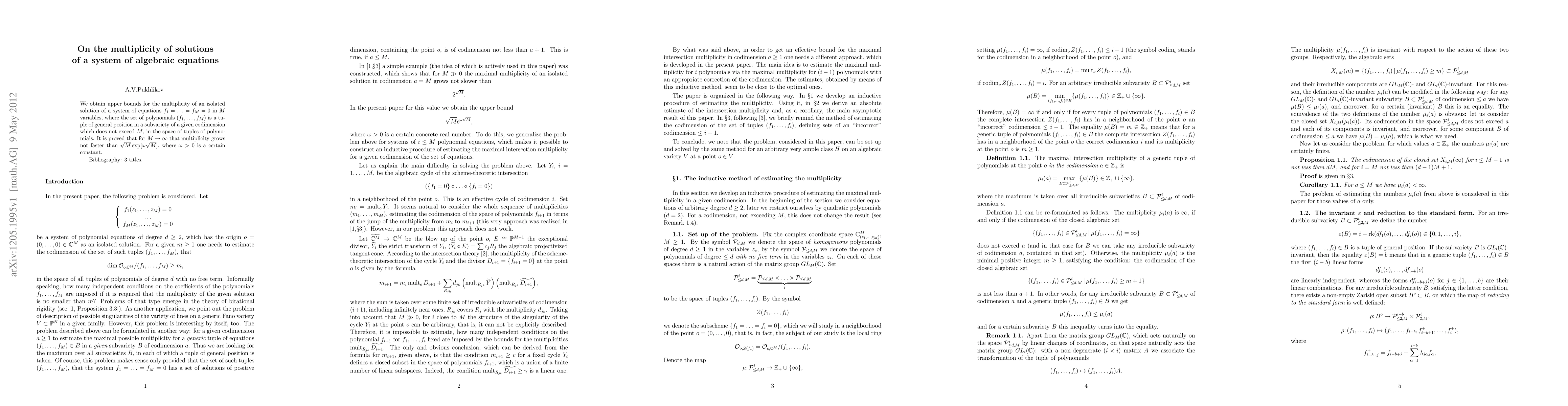 We obtain upper bounds for the multiplicity of an isolated solution of a system of equations $f_1=...= f_M =0$ in $M$ variables, where the set of polynomials $(f_1,..., f_M)$ is a tuple of general position in a subvariety of a given codimension which does not exceed $M$, in the space of tuples of polynomials. It is proved that for $M\to\infty$ that multiplicity grows not faster than $\sqrt{M}\exp[\omega\sqrt{M}]$, where $\omega>0$ is a certain constant.