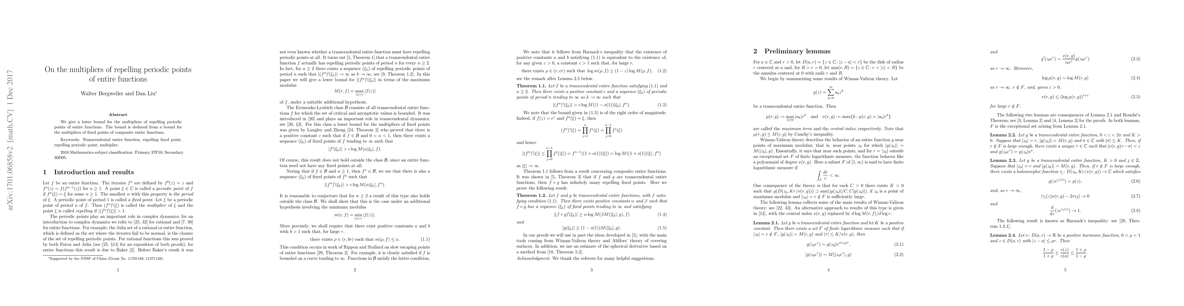 Summary: This paper establishes a lower bound for the multipliers of repelling periodic points of entire functions, derived from a bound for the multipliers of fixed points in composite entire functions. The findings provide new insights into the dynamics of entire functions.