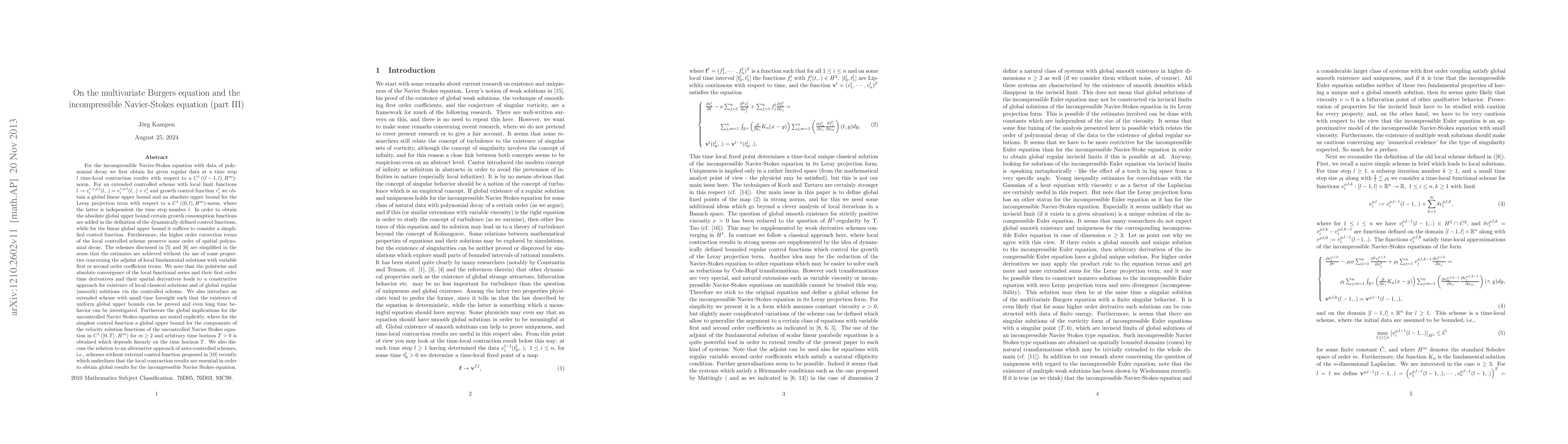 In this paper we first obtain local contraction results in a Hm-norm with respect to time and space for a local scheme. We show that a global controlled scheme preserves higher order regularity with respect to the spatial variables together with polynomial decay of order m of the data at each time step. Here, we simplify the controlled scheme considered in [1] and [2]. Especially, for the simplified controlled scheme we get an upper bound for the Leray projection term. Furthermore, the schemes discussed in [1] and [2] are simplified in the sense that the estimates are achieved without the use of some properties concerning the adjoint of a local fundamental solutions with variable drift terms. We note that the pointwise and absolute convergence of the local functional series and their first order time derivatives and their spatial derivatives leads to a constructive approach of local and global classical solutions.
