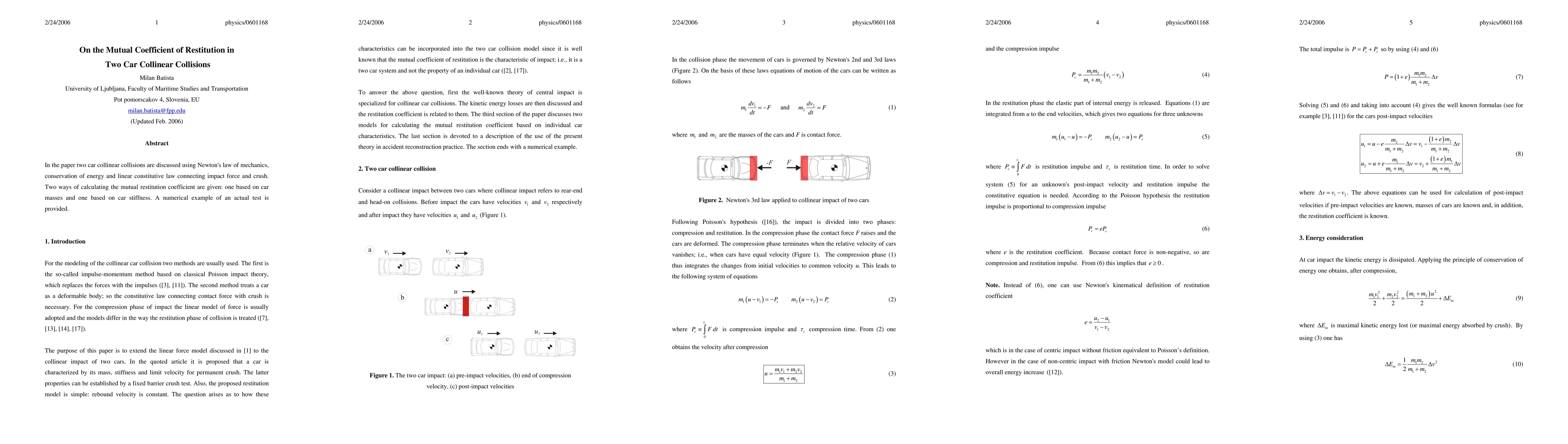 This paper explores two-car collinear collisions, presenting methods to calculate mutual restitution coefficients based on car masses and stiffness. It uses Newton's law, energy conservation, and constitutive laws, supported by a real-world test example.