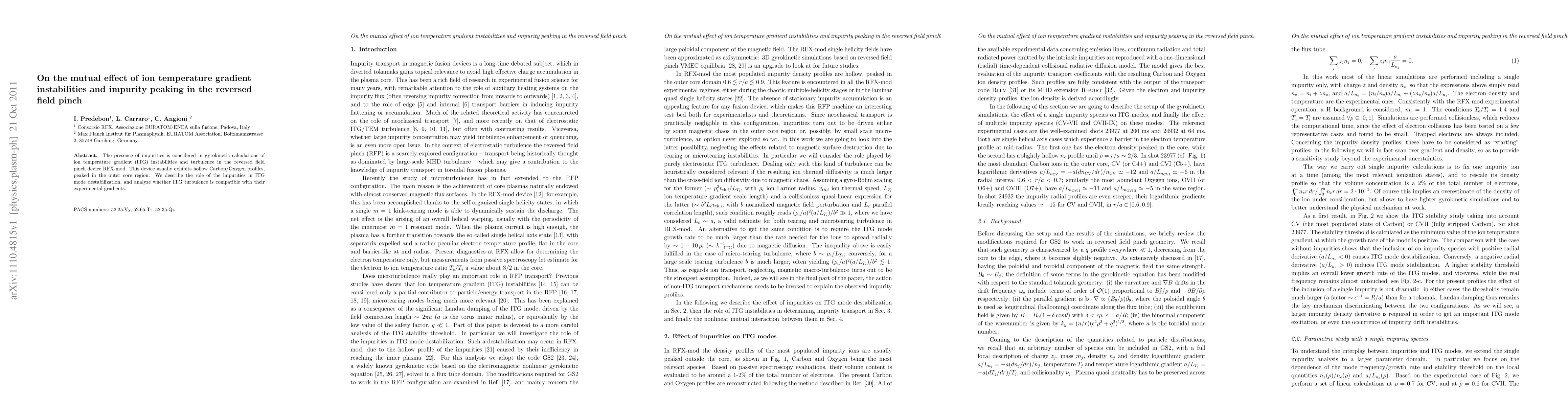 The presence of impurities is considered in gyrokinetic calculations of ion temperature gradient (ITG) instabilities and turbulence in the reversed field pinch device RFX-mod. This device usually exhibits hollow Carbon/Oxygen profiles, peaked in the outer core region. We describe the role of the impurities in ITG mode destabilization, and analyze whether ITG turbulence is compatible with their experimental gradients.