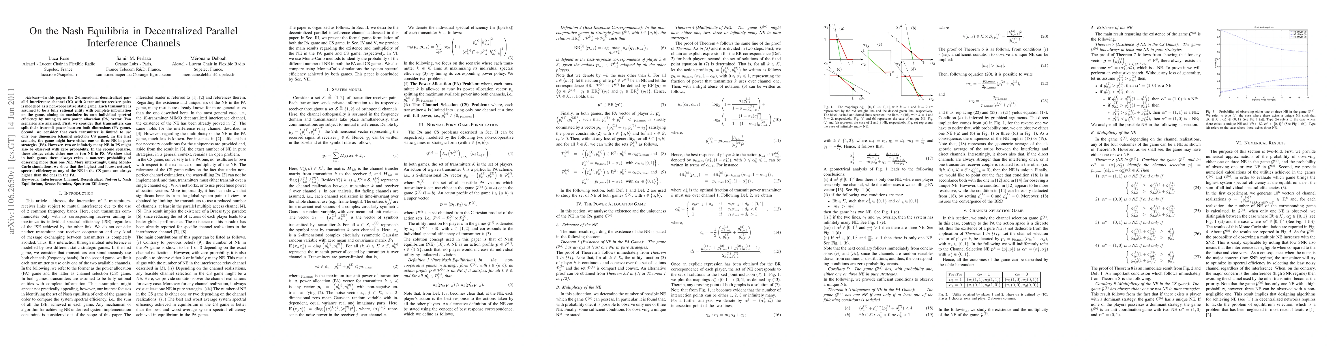 In this paper, the 2-dimensional decentralized parallel interference channel (IC) with 2 transmitter-receiver pairs is modelled as a non-cooperative static game. Each transmitter is assumed to be a fully rational entity with complete information on the game, aiming to maximize its own individual spectral efficiency by tuning its own power allocation (PA) vector. Two scenarios are analysed. First, we consider that transmitters can split their transmit power between both dimensions (PA game). Second, we consider that each transmitter is limited to use only one dimension (channel selection CS game). In the first scenario, the game might have either one or three NE in pure strategies (PS). However, two or infinitely many NE in PS might also be observed with zero probability. In the second scenario, there always exists either one or two NE in PS. We show that in both games there always exists a non-zero probability of observing more than one NE. More interestingly, using Monte-Carlo simulations, we show that the highest and lowest network spectral efficiency at any of the NE in the CS game are always higher than the ones in the PA.