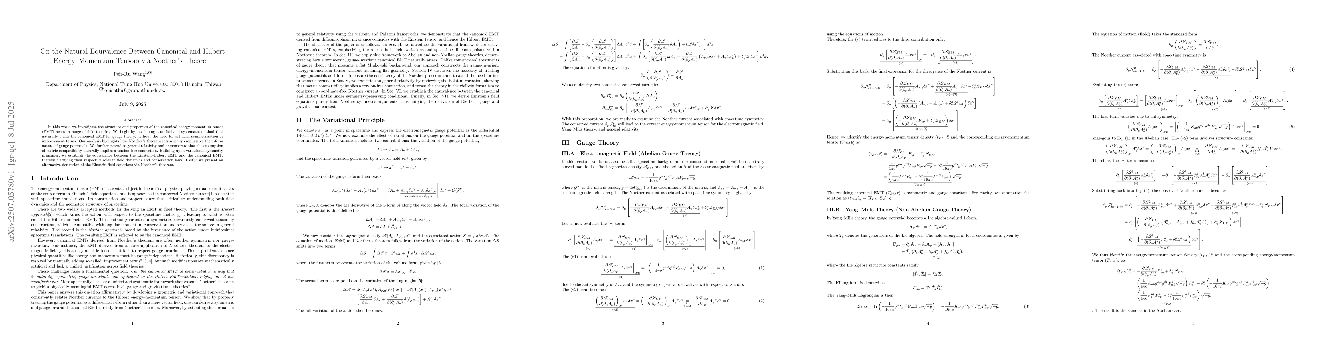 The research presents a novel perspective on the equivalence between the Hilbert energy-momentum tensor and the canonical EMT derived from Noether's theorem, providing a unified framework for understanding energy-momentum conservation in gauge theories and general relativity.