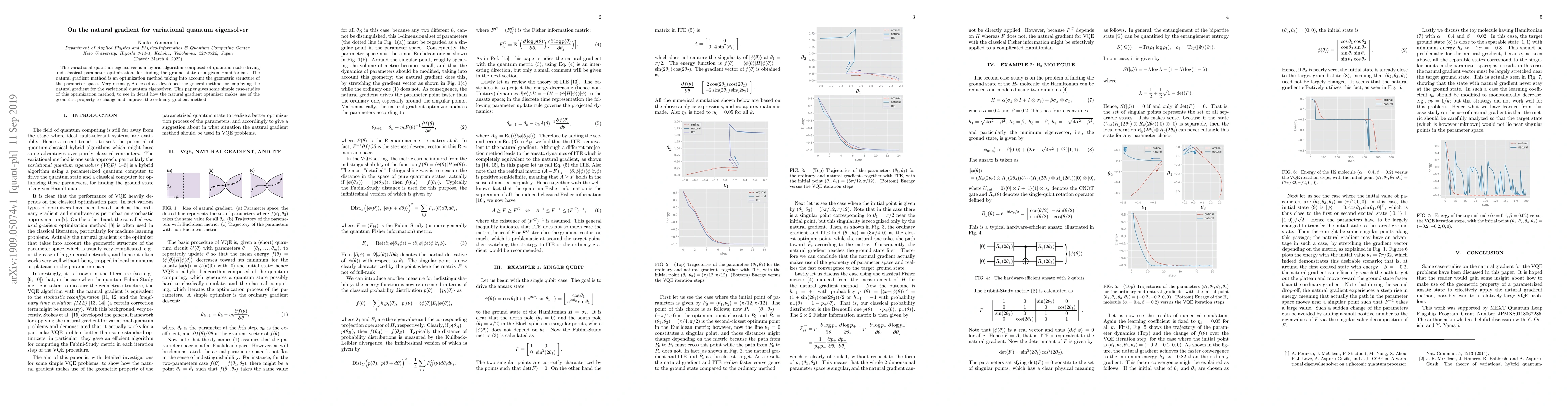 This paper explores the application of the natural gradient method to the variational quantum eigensolver, demonstrating through case studies how it leverages the geometric structure of the parameter space to enhance optimization over the traditional gradient method.