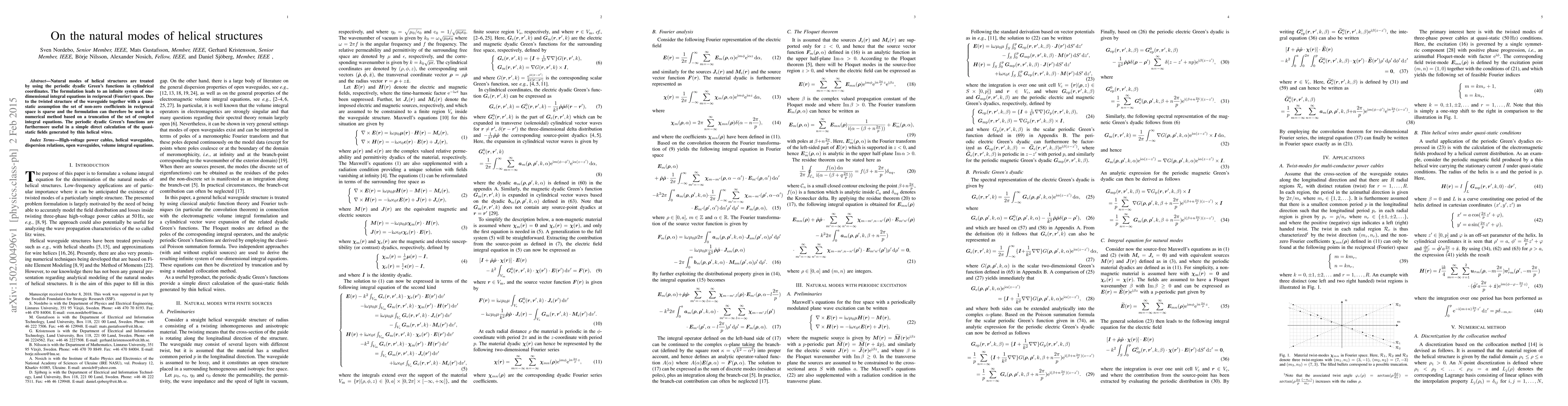 Natural modes of helical structures are treated by using the periodic dyadic Green's functions in cylindrical coordinates. The formulation leads to an infinite system of one-dimensional integral equations in reciprocal (Fourier) space. Due to the twisted structure of the waveguide together with a quasi-static assumption the set of non-zero coefficients in reciprocal space is sparse and the formulation can therefore be used in a numerical method based on a truncation of the set of coupled integral equations. The periodic dyadic Green's functions are furthermore useful in a simple direct calculation of the quasi-static fields generated by thin helical wires.