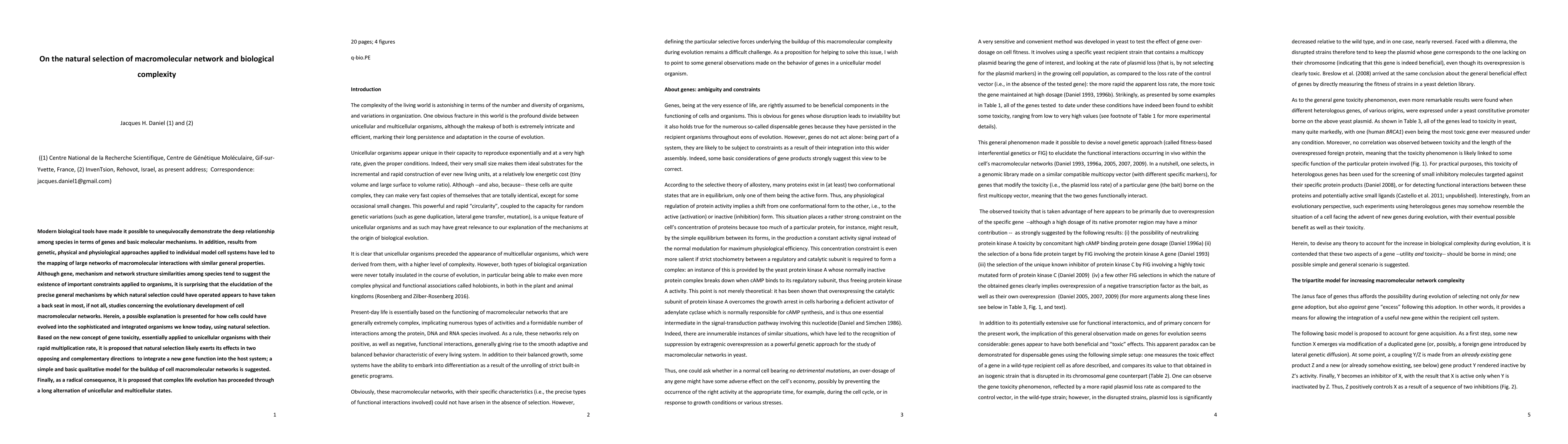 This paper explores the evolution of macromolecular networks in cells, proposing that natural selection integrates new gene functions through opposing mechanisms. It suggests that complex life evolved via alternating unicellular and multicellular states, driven by the concept of gene toxicity in rapidly multiplying organisms.