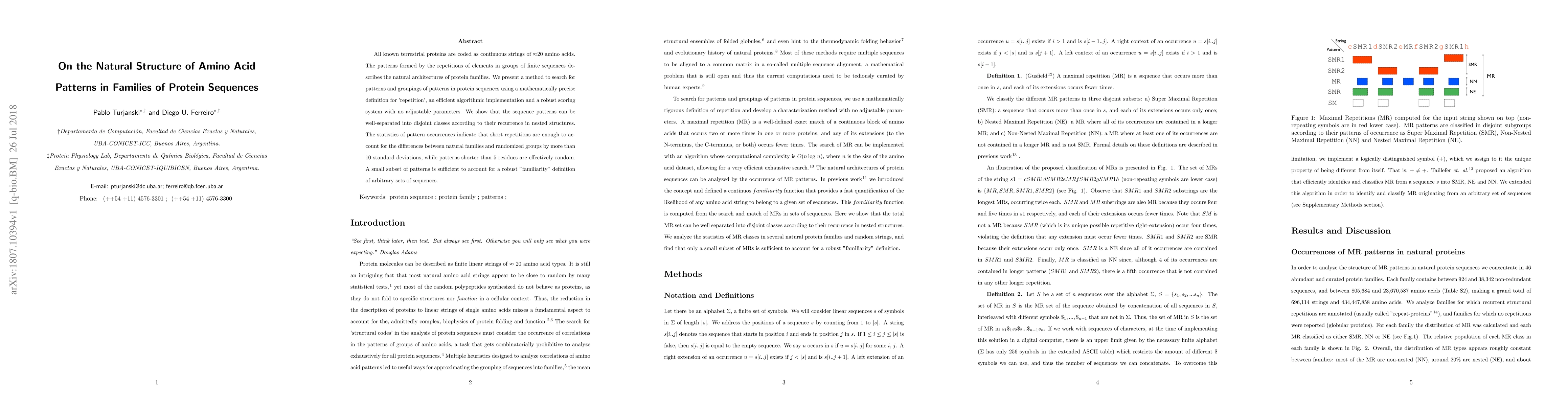 This paper introduces a method to identify and classify amino acid patterns in protein sequences, revealing that short repetitions significantly differentiate natural protein families from random sequences. The approach uses a precise definition of 'repetition' and a robust scoring system, showing that a small subset of patterns can define 'familiarity' among sequence sets.