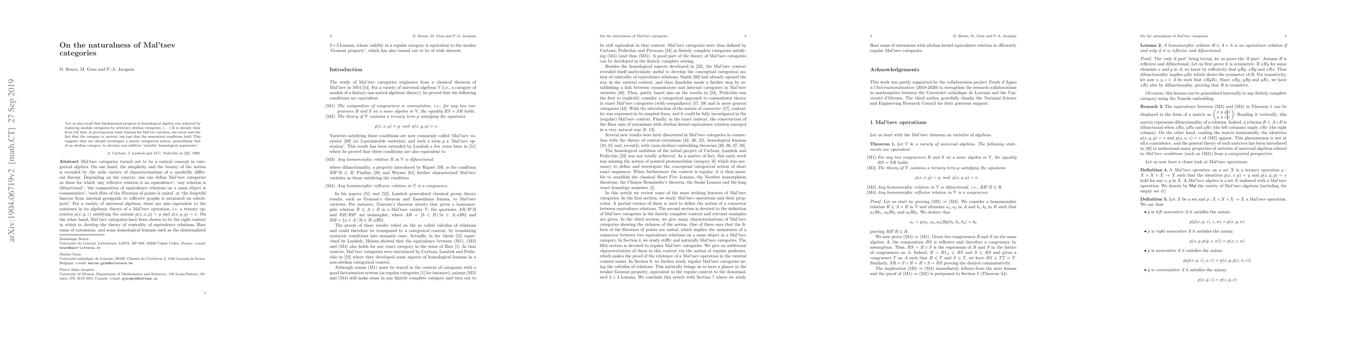 Mal'tsev categories turned out to be a central concept in categorical algebra. On one hand, the simplicity and the beauty of the notion is revealed through a lot of characterizations of different flavour. Depending on the context, one can define Mal'tsev categories as those for which `any reflexive relation is an equivalence'; `any relation is difunctional'; `the composition of equivalence relations on a same object is commutative'; `each fibre of the fibration of points is unital' or `the forgetful functor from internal groupoids to reflexive graphs is saturated on subobjects'. For a variety of universal algebras, these are also equivalent to the existence in its algebraic theory of a Mal'tsev operation, i.e. a ternary operation $p(x,y,z)$ satisfying the axioms $p(x,x,y)=y$ and $p(x,y,y)=x$. On the other hand, Mal'tsev categories have been shown to be the right context in which to develop the theory of centrality of equivalence relations, Baer sums of extensions, and some homological lemmas such as the denormalized $3 \times 3$ Lemma, whose validity in a regular category is equivalent to the weaker `Goursat property', which has also turned out to be of wide interest.