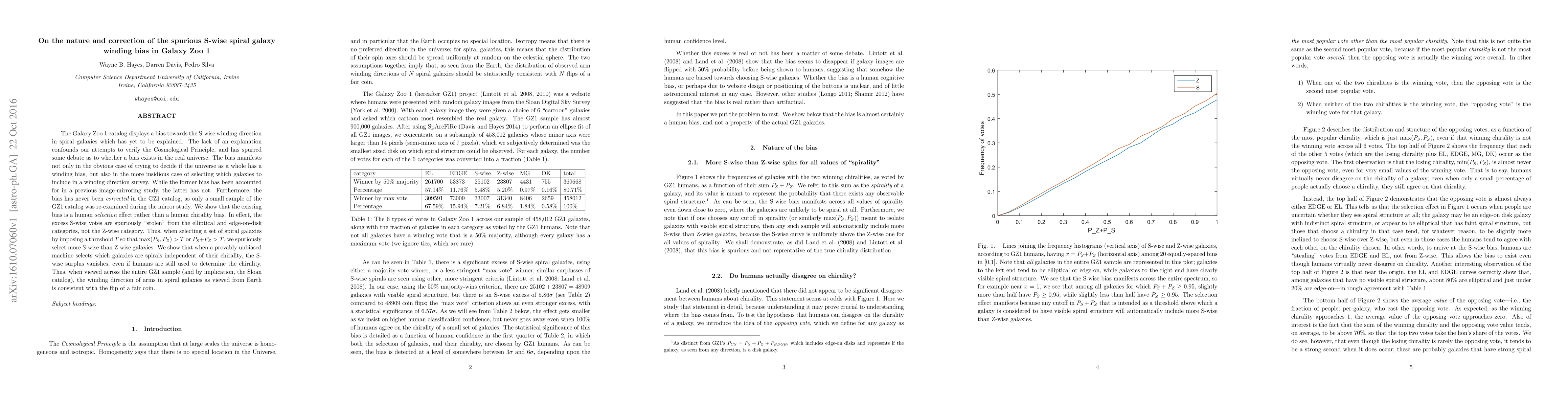 The Galaxy Zoo 1 catalog displays a bias towards the S-wise winding direction in spiral galaxies which has yet to be explained. The lack of an explanation confounds our attempts to verify the Cosmological Principle, and has spurred some debate as to whether a bias exists in the real universe. The bias manifests not only in the obvious case of trying to decide if the universe as a whole has a winding bias, but also in the more insidious case of selecting which galaxies to include in a winding direction survey. While the former bias has been accounted for in a previous image-mirroring study, the latter has not. Furthermore, the bias has never been {\em corrected} in the GZ1 catalog, as only a small sample of the GZ1 catalog was re-examined during the mirror study. We show that the existing bias is a human {\em selection} effect rather than a human chirality bias. In effect, the excess S-wise votes are spuriously "stolen" from the elliptical and edge-on-disk categories, not the Z-wise category. Thus, when selecting a set of spiral galaxies by imposing a threshold $T$ so that $\max(P_S,P_Z) > T$ or $P_S+P_Z>T$, we spuriously select more S-wise than Z-wise galaxies. We show that when a provably unbiased machine selects which galaxies are spirals independent of their chirality, the S-wise surplus vanishes, even if humans are still used to determine the chirality. Thus, when viewed across the entire GZ1 sample (and by implication, the Sloan catalog), the winding direction of arms in spiral galaxies as viewed from Earth is consistent with the flip of a fair coin.