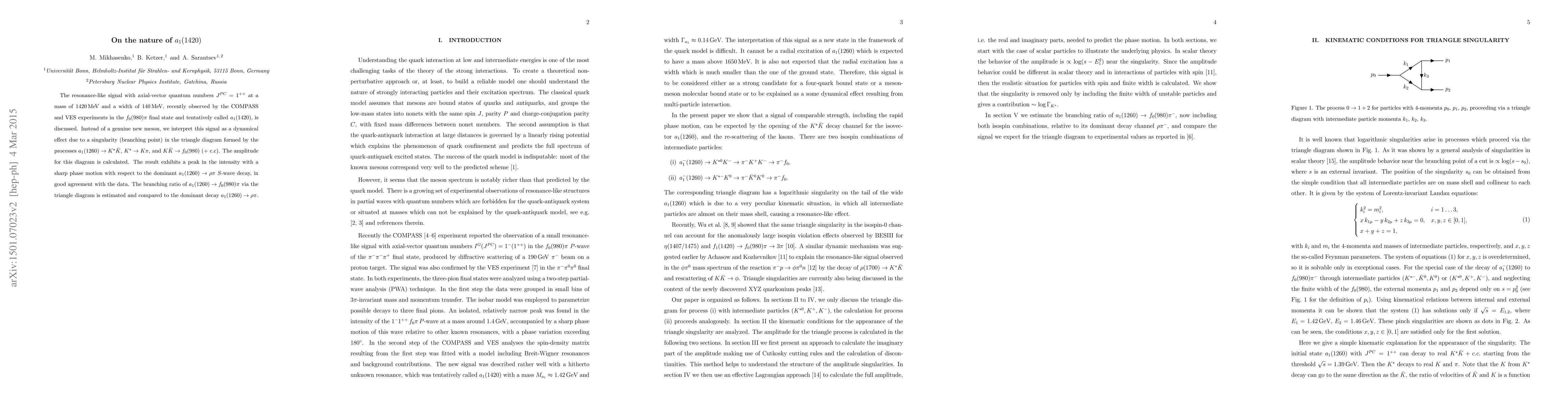 This paper discusses the $a_1(1420)$ resonance observed in experiments, suggesting it is not a new meson but a dynamical effect from a singularity in a triangle diagram involving $a_1(1260)$ decays. The calculated amplitude shows a peak consistent with the observed data, indicating the $a_1(1260)$ decay via $f_0(980)\pi$ is minor compared to the dominant $\rho\pi$ decay.