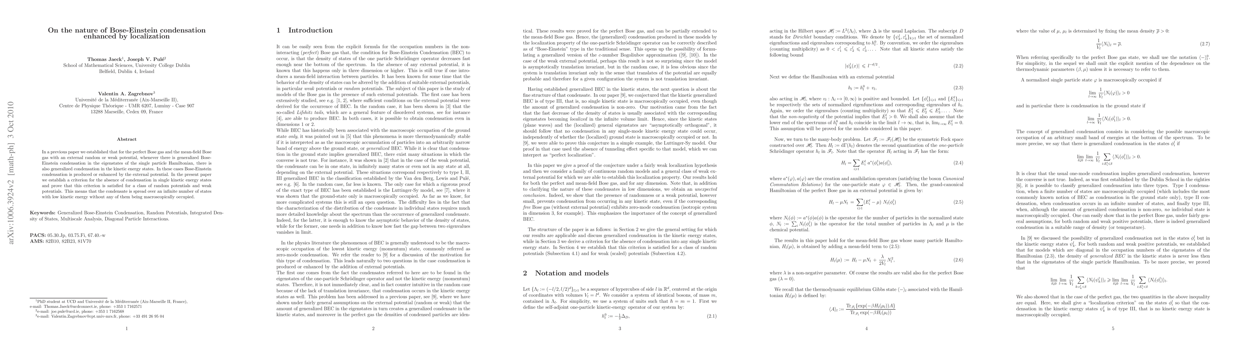 This paper establishes a criterion for the absence of Bose-Einstein condensation in kinetic energy states when enhanced by localization in random or weak potentials, proving it holds for certain potentials, thereby confirming condensation occurs across multiple low-energy states without macroscopic occupation.