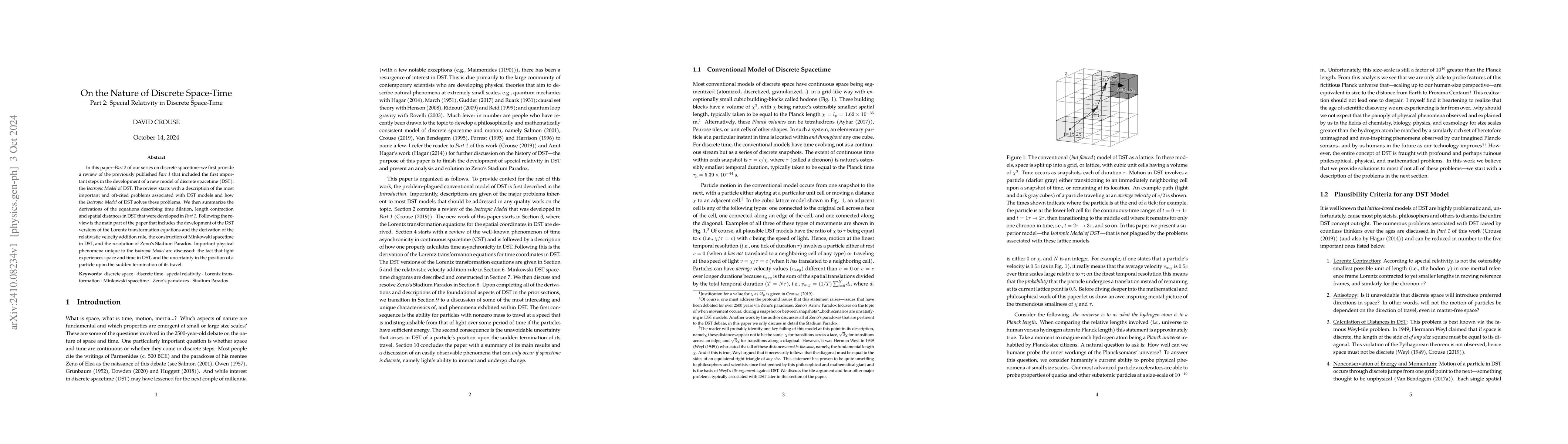 This paper reviews the Isotropic Model of Discrete Space-Time (DST) and its solutions to common DST issues, followed by a development of DST versions of the Lorentz transformation equations, relativistic velocity addition, and Minkowski spacetime construction, resolving Zeno's Paradox and discussing unique phenomena like light's experience in DST.