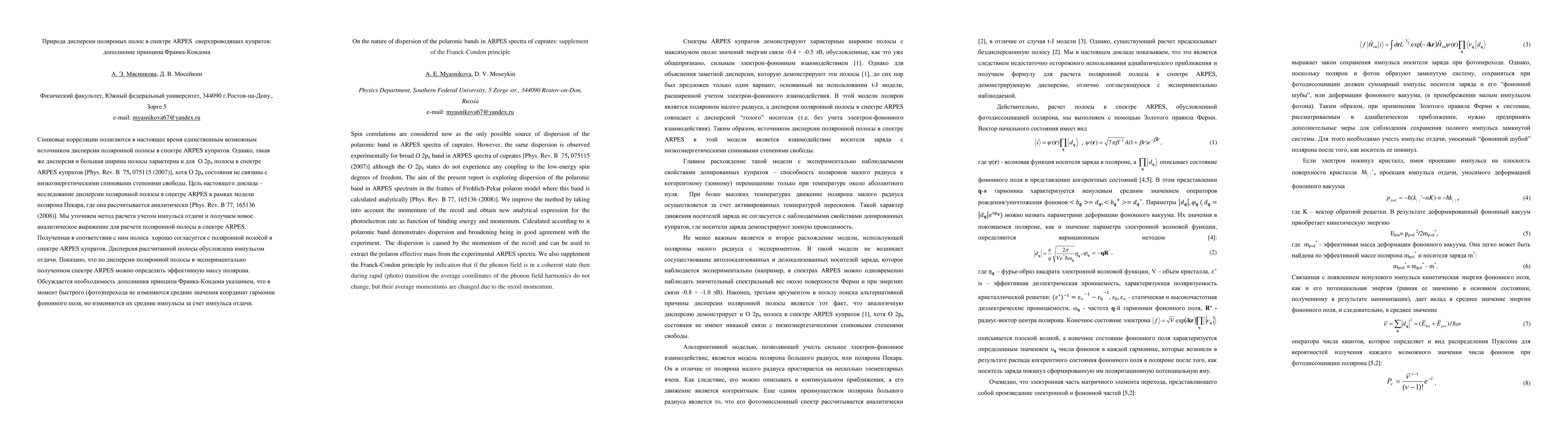 This paper investigates the dispersion of polaronic bands in ARPES spectra of cuprates using the Fröhlich-Pekar polaron model, finding that the observed dispersion is due to the momentum of the recoil rather than spin correlations. It supplements the Franck-Condon principle by showing that phonon field momentum changes during rapid transitions, allowing extraction of the polaron effective mass from experimental data.