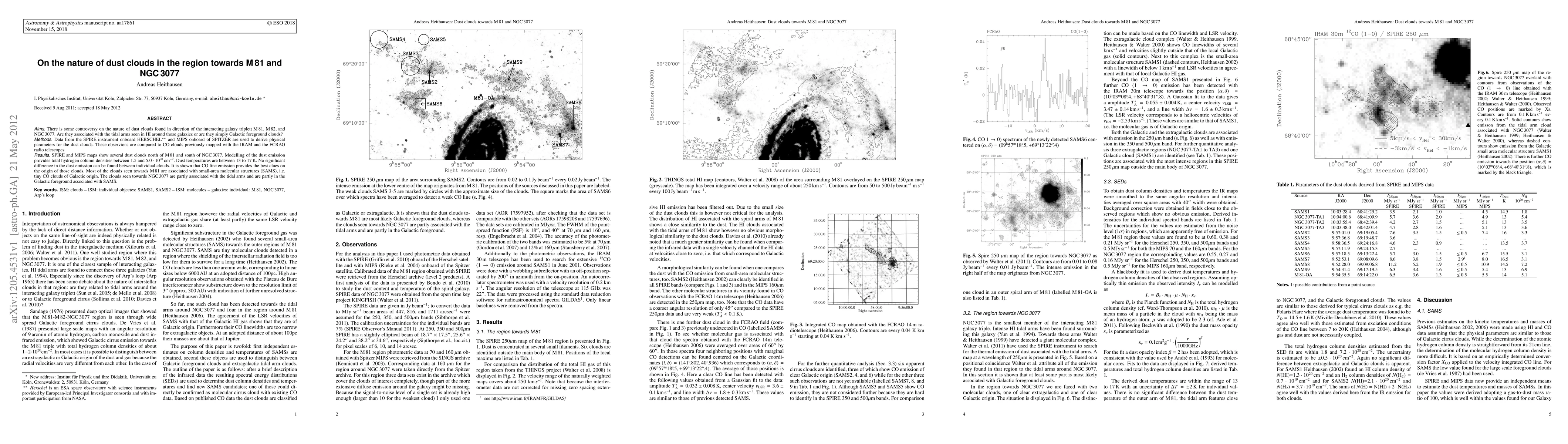 There is some controversy on the nature of dust clouds found in direction of the interacting galaxy triplett M81, M82, and NGC3077. Are they associated with the tidal arms seen in HI around those galaxies or are they simply Galactic foreground clouds? Data from the SPIRE instrument onboard HERSCHEL and MIPS onboard of SPITZER are used to derive physical parameters for the dust clouds. These observions are compared to CO clouds previously mapped with the IRAM and the FCRAO radio telescopes.SPIRE and MIPS maps show several dust clouds north of M81 and south of NGC3077. Modelling of the dust emission provides total hydrogen column densities between 1.5 and 5.0 * 10^20 cm^-2. Dust temperatures are between 13 to 17K. No significant difference in the dust emission can be found between individual clouds. It is shown that CO line emission provides the best clues on the origin of those clouds. Most of the clouds seen towards M81 are associated with small-area molecular structures (SAMS), i.e. tiny CO clouds of Galactic origin. The clouds seen towards NGC3077 are partly associated with the tidal arms and are partly in the Galactic foreground associated with SAMS.