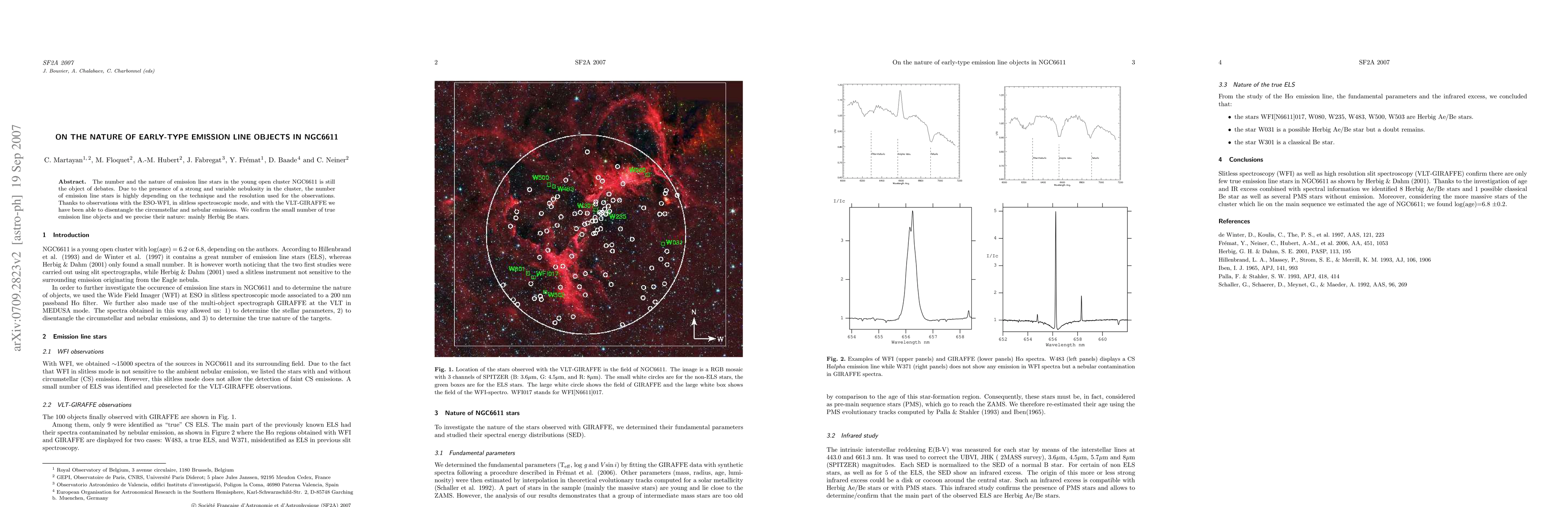 The study utilizes ESO-WFI and VLT-GIRAFFE observations to disentangle nebular and circumstellar emissions in NGC6611, confirming a small number of true emission line objects, primarily identified as Herbig Be stars.