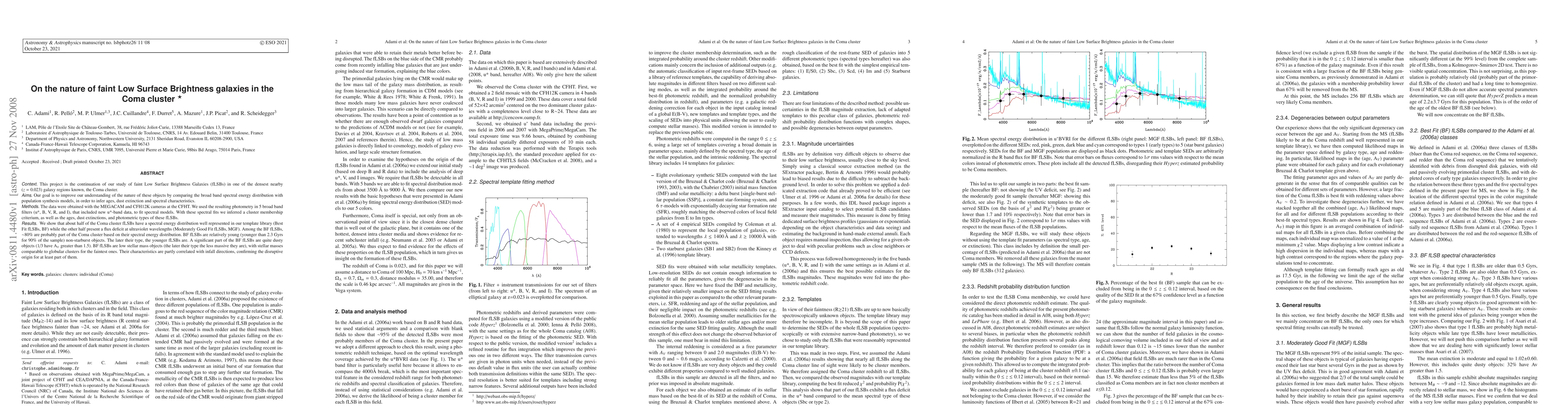 This project is the continuation of our study of faint Low Surface Brightness Galaxies (fLSBs) in one of the densest nearby galaxy regions known, the Coma cluster. Our goal is to improve our understanding of the nature of these objects by comparing the broad band spectral energy distribution with population synthesis models. The data were obtained with the MEGACAM and CFH12K cameras at the CFHT. We used the resulting photometry in 5 broad band filters (u*, B, V, R, and I), that included new u*-band data, to fit spectral models. With these spectral fits we inferred a cluster membership criterium, as well as the ages, dust extinctions, and photometric types of these fLSBs. We show that about half of the Coma cluster fLSBs have a spectral energy distribution well represented in our template library while the other half present a flux deficit at ultraviolet wavelengths. Among the well represented, ~80% are probably part of the Coma cluster based on their spectral energy distribution. They are relatively young (younger than 2.3 Gyrs for 90% of the sample) non-starburst objects. The later their type, the younger fLSBs are. A significant part of the fLSBs are quite dusty objects. fLSBs are low stellar mass objects (the later their type the less massive they are), with stellar masses comparable to globular clusters for the faintest ones. Their characteristics are correlated with infall directions, confirming the disruptive origin for part of them.