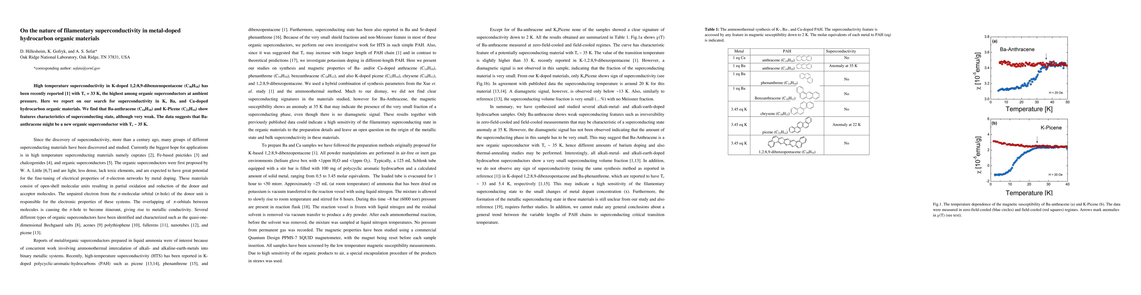High temperature superconductivity in K-doped 1,2:8,9-dibenzenopentacene (C30H18) has been recently reported [1] with Tc = 33 K, the highest among organic superconductors at ambient pressure. Here we report on our search for superconductivity in K, Ba, and Ca-doped hydrocarbon organic materials. We find that Ba-anthracene (C14H10) and K-Picene (C22H14) show features characteristics of superconducting state, although very weak. The data suggests that Ba-anthracene might be a new organic superconductor with Tc ~ 35 K.