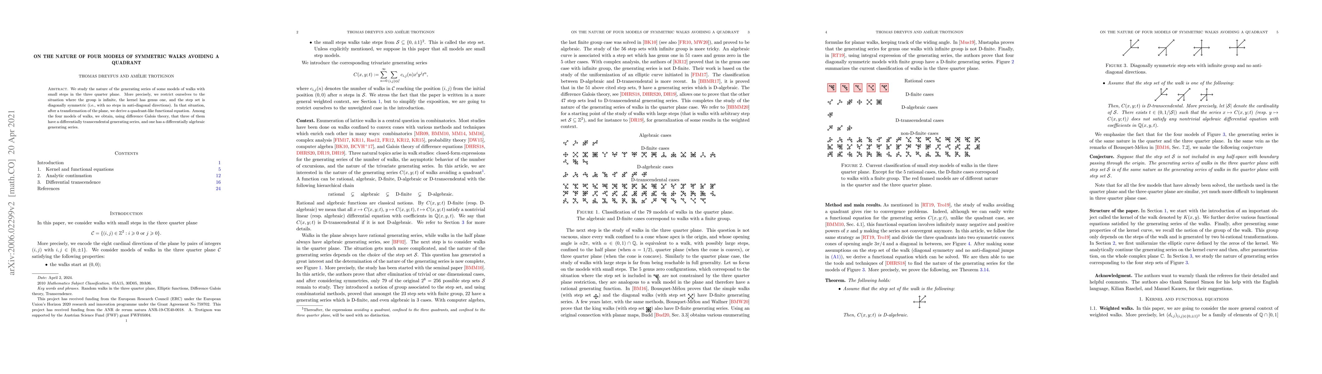 This paper investigates the generating series of symmetric walks avoiding a quadrant in the three-quarter plane, revealing that three of the four models have differentially transcendental generating series, while one has a differentially algebraic series, determined via difference Galois theory.