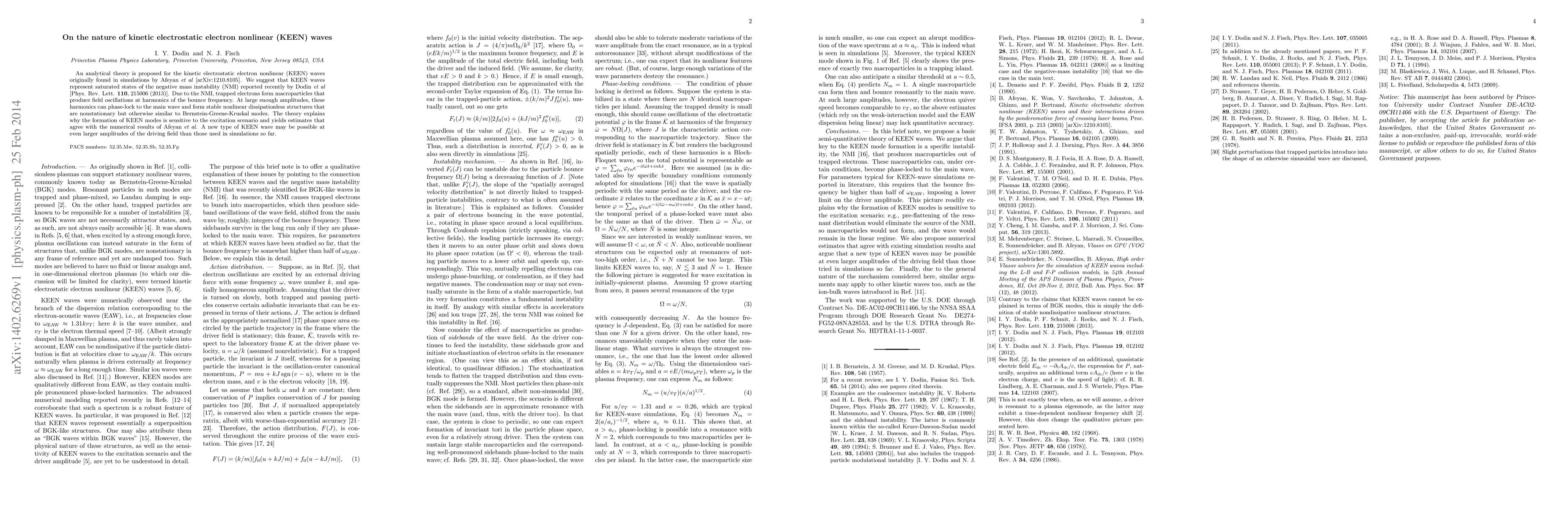 An analytical theory is proposed for the kinetic electrostatic electron nonlinear (KEEN) waves originally found in simulations by Afeyan et al [arXiv:1210.8105]. We suggest that KEEN waves represent saturated states of the negative mass instability (NMI) reported recently by Dodin et al [Phys. Rev. Lett. 110, 215006 (2013)]. Due to the NMI, trapped electrons form macroparticles that produce field oscillations at harmonics of the bounce frequency. At large enough amplitudes, these harmonics can phase-lock to the main wave and form stable nonlinear dissipationless structures that are nonstationary but otherwise similar to Bernstein-Greene-Kruskal modes. The theory explains why the formation of KEEN modes is sensitive to the excitation scenario and yields estimates that agree with the numerical results of Afeyan et al. A new type of KEEN wave may be possible at even larger amplitudes of the driving field than those used in simulations so far.