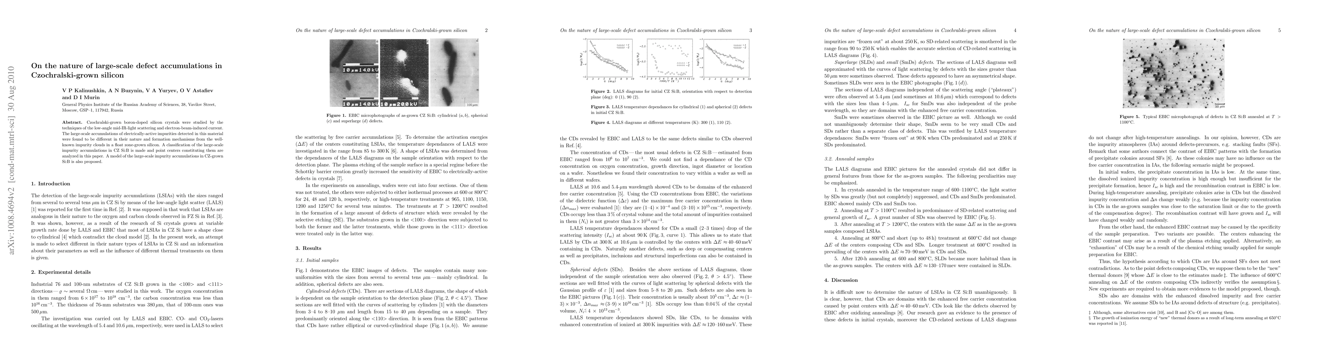 The research examines large-scale defect accumulations in Czochralski-grown boron-doped silicon crystals, distinguishing them from float zone-grown silicon impurities. Utilizing low-angle mid-IR-light scattering and electron-beam-induced current techniques, the study classifies these accumulations, analyzes point centers, and proposes a model for CZ-grown Si:B impurity accumulations.