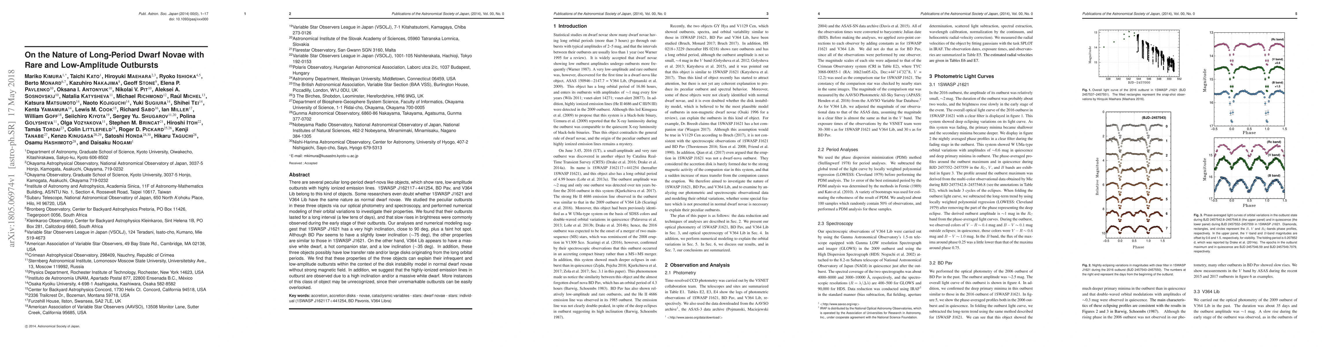 There are several peculiar long-period dwarf-nova like objects, which show rare, low-amplitude outbursts with highly ionized emission lines. 1SWASP J162117$+$441254, BD Pav, and V364 Lib belong to this kind of objects. Some researchers even doubt whether 1SWASP J1621 and V364 Lib have the same nature as normal dwarf novae. We studied the peculiar outbursts in these three objects via our optical photometry and spectroscopy, and performed numerical modeling of their orbital variations to investigate their properties. We found that their outbursts lasted for a long interval (a few tens of days), and that slow rises in brightness were commonly observed during the early stage of their outbursts. Our analyses and numerical modeling suggest that 1SWASP J1621 has a very high inclination, close to 90 deg, plus a faint hot spot. Although BD Pav seems to have a slightly lower inclination ($\sim$75 deg), the other properties are similar to those in 1SWASP J1621. On the other hand, V364 Lib appears to have a massive white dwarf, a hot companion star, and a low inclination ($\sim$35 deg). In addition, these three objects possibly have low transfer rate and/or large disks originating from the long orbital periods. We find that these properties of the three objects can explain their infrequent and low-amplitude outbursts within the context of the disk instability model in normal dwarf novae without strong magnetic field. In addition, we suggest that the highly-ionized emission lines in outburst are observed due to a high inclination and/or a massive white dwarf. More instances of this class of object may be unrecognized, since their unremarkable outbursts can be easily overlooked.