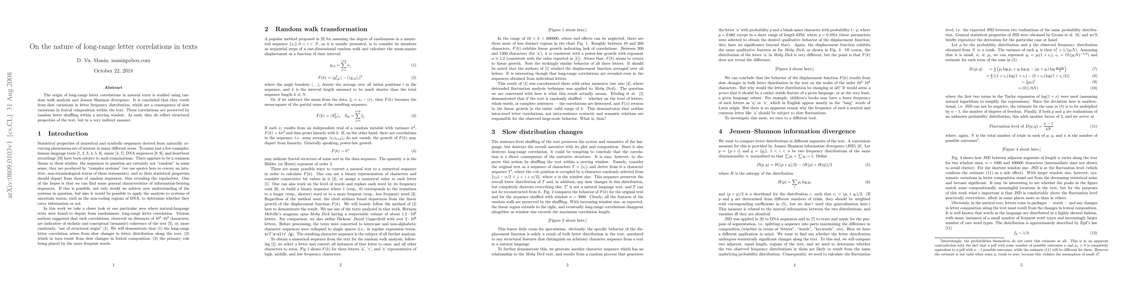 The origin of long-range letter correlations in natural texts is studied using random walk analysis and Jensen-Shannon divergence. It is concluded that they result from slow variations in letter frequency distribution, which are a consequence of slow variations in lexical composition within the text. These correlations are preserved by random letter shuffling within a moving window. As such, they do reflect structural properties of the text, but in a very indirect manner.