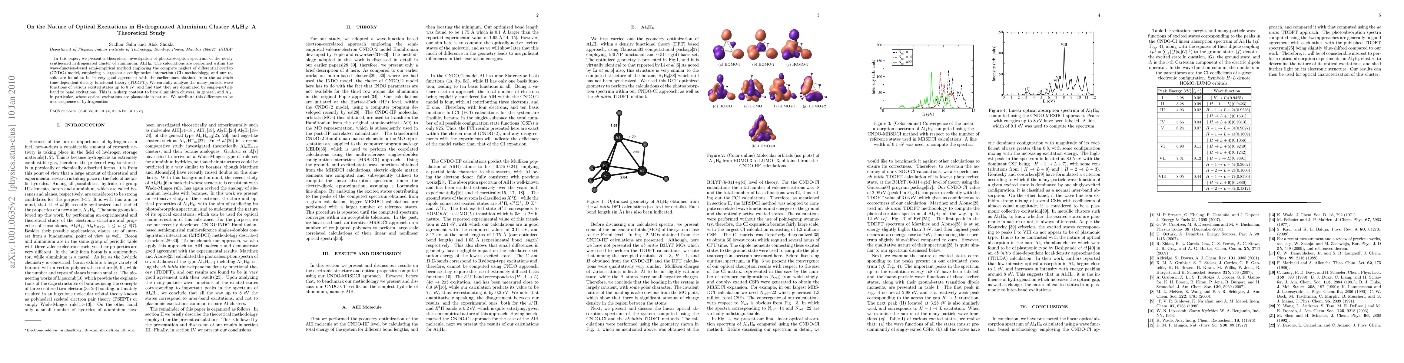In this paper, we present a theoretical investigation of photoabsorption spectrum of the newly synthesized hydrogenated cluster of aluminium, Al4H6. The calculations are performed within the wave-function-based semi-empirical method employing the complete neglect of differential overlap (CNDO) model, employing a large-scale configuration interaction (CI) methodology, and our results are found to be in very good agreement with the earlier ones obtained from the ab initio time-dependent density functional theory (TDDFT). We carefully analyse the many-particle wave functions of various excited states up to 8 eV, and find that they are dominated by single-particle band to band excitations. This is in sharp contrast to bare aluminium clusters, in general, and Al4, in particular, whose optical excitations are plasmonic in nature. We attribute this difference to be a consequence of hydrogenation.