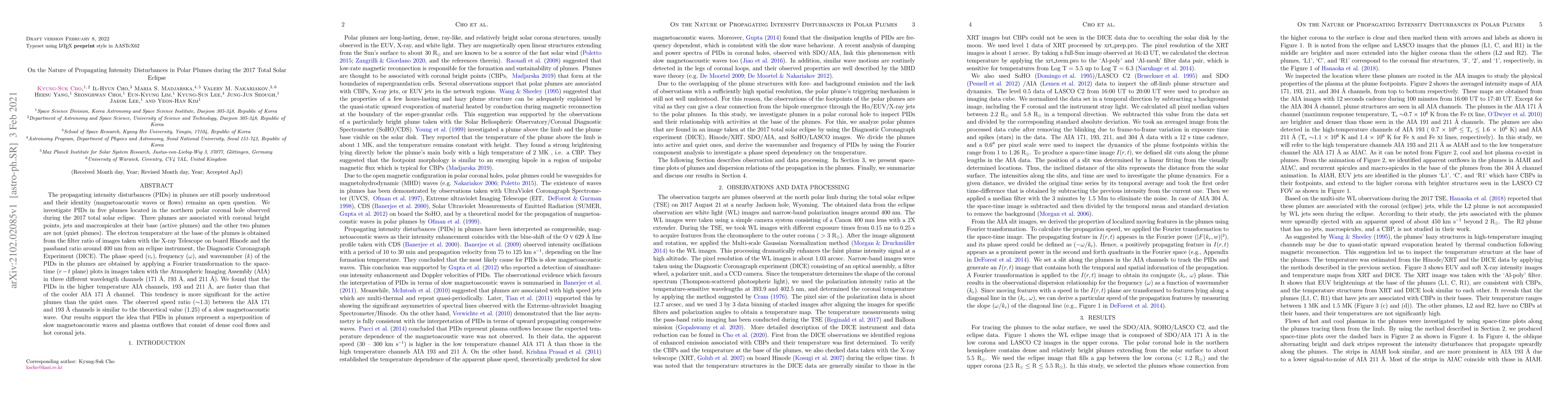 The propagating intensity disturbances (PIDs) in plumes are still poorly understood and their identity (magnetoacoustic waves or flows) remains an open question. We investigate PIDs in five plumes located in the northern polar coronal hole observed during the 2017 total solar eclipse. Three plumes are associated with coronal bright points, jets and macrospicules at their base (active plumes) and the other two plumes are not (quiet plumes). The electron temperature at the base of the plumes is obtained from the filter ratio of images taken with the X-ray Telescope on board Hinode and the passband ratio around 400 nm from an eclipse instrument, the Diagnostic Coronagraph Experiment (DICE). The phase speed (v_r), frequency (omega), and wavenumber (k) of the PIDs in the plumes are obtained by applying a Fourier transformation to the space-time (r-t plane) plots in images taken with the Atmospheric Imaging Assembly (AIA) in three different wavelength channels (171 A, 193 A, and 211 A). We found that the PIDs in the higher temperature AIA channels, 193 and 211 A, are faster than that of the cooler AIA 171 A channel. This tendency is more significant for the active plumes than the quiet ones. The observed speed ratio (~1.3) between the AIA 171 and 193 A channels is similar to the theoretical value (1.25) of a slow magnetoacoustic wave. Our results support the idea that PIDs in plumes represent a superposition of slow magnetoacoustic waves and plasma outflows that consist of dense cool flows and hot coronal jets.