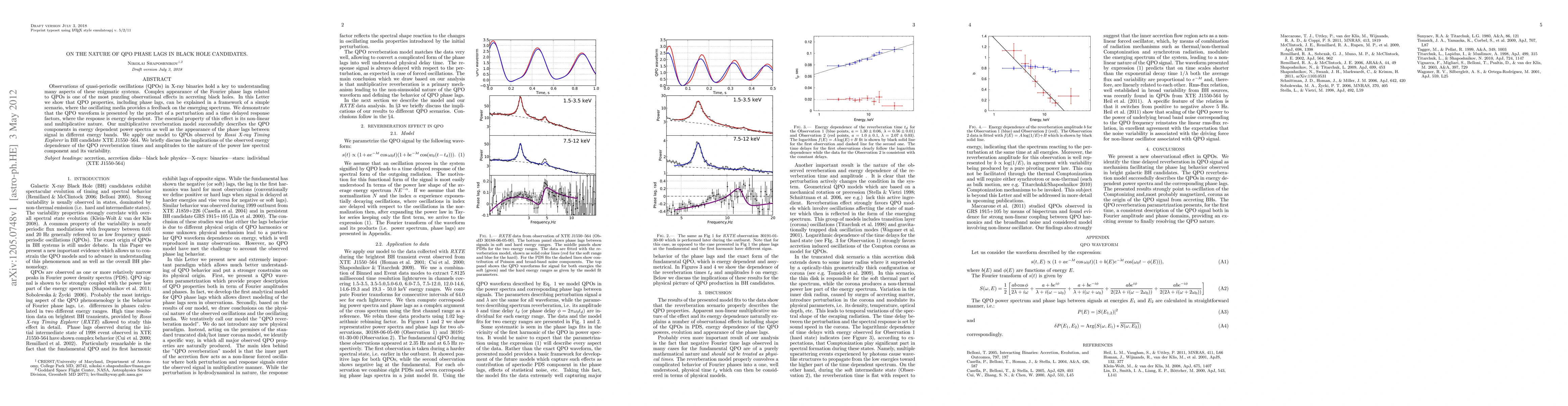Observations of quasi-periodic oscillations (QPOs) in X-ray binaries hold a key to understanding many aspects of these enigmatic systems. Complex appearance of the Fourier phase lags related to QPOs is one of the most puzzling observational effects in accreting black holes. In this Letter we show that QPO properties, including phase lags, can be explained in a framework of a simple scenario, where the oscillating media provides a feedback on the emerging spectrum. We demonstrate that the QPO waveform is presented by the product of a perturbation and a time delayed response factors, where the response is energy dependent. The essential property of this effect is its non-linear and multiplicative nature. Our multiplicative reverberation model successfully describes the QPO components in energy dependent power spectra as well as the appearance of the phase lags between signal in different energy bands. We apply our model to QPOs observed by Rossi X-ray Timing Explorer in BH candidate XTE J1550-564. We briefly discuss the implications of the observed energy dependence of the QPO reverberation times and amplitudes to the nature of the power law spectral component and its variability.