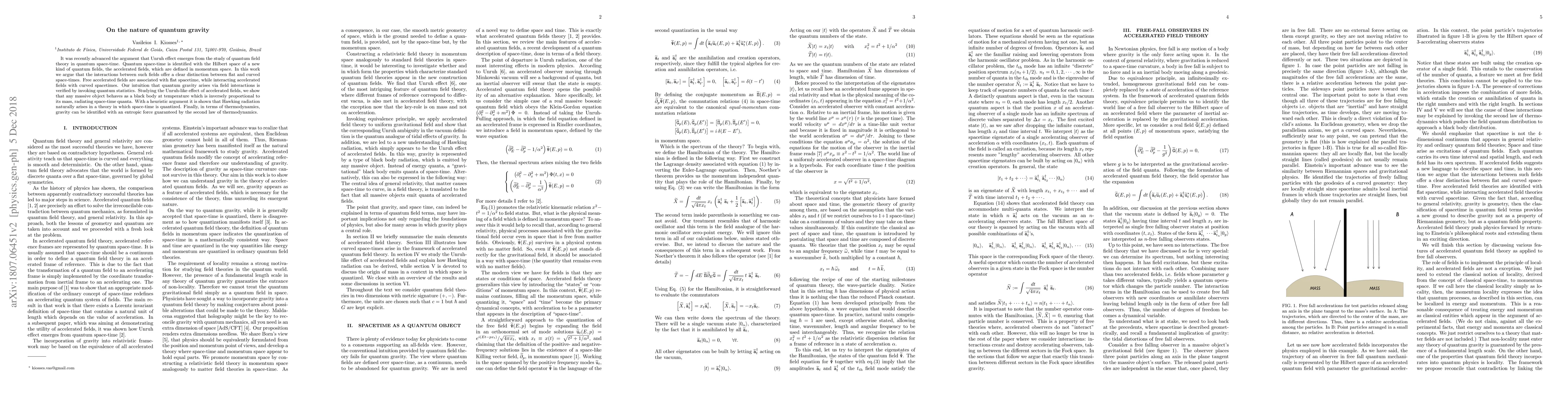 This paper explores the nature of quantum gravity by studying accelerated fields in momentum space, revealing a clear distinction between flat and curved spacetimes. It also provides a theoretical explanation for Hawking radiation and identifies gravity as an entropic force guaranteed by the second law of thermodynamics.