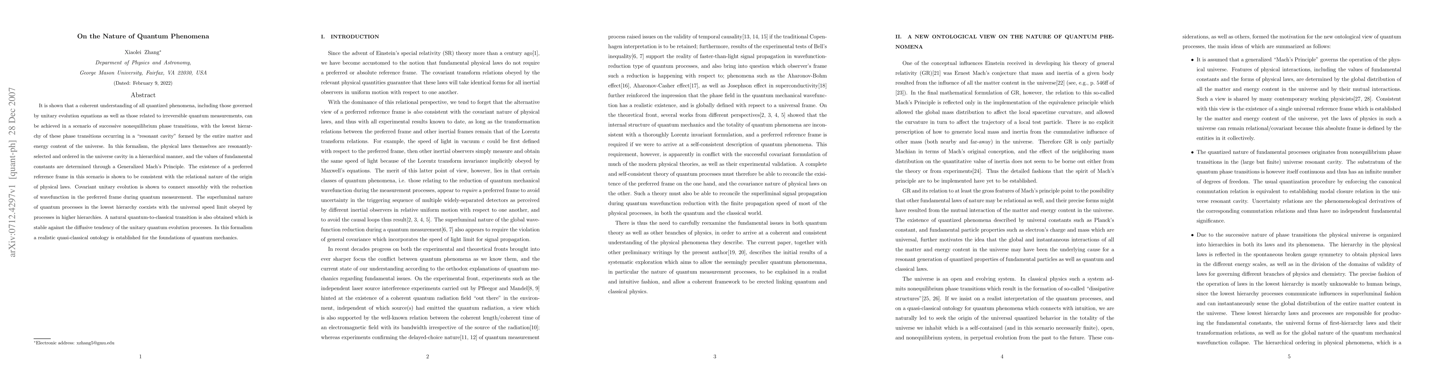 It is shown that a coherent understanding of all quantized phenomena, including those governed by unitary evolution equations as well as those related to irreversible quantum measurements, can be achieved in a scenario of successive nonequilibrium phase transitions, with the lowest hierarchy of these phase transitions occurring in a ``resonant cavity'' formed by the entire matter and energy content of the universe. In this formalism, the physical laws themselves are resonantly-selected and ordered in the universe cavity in a hierarchical manner, and the values of fundamental constants are determined through a Generalized Mach's Principle. The existence of a preferred reference frame in this scenario is shown to be consistent with the relational nature of the origin of physical laws. Covariant unitary evolution is shown to connect smoothly with the reduction of wavefunction in the preferred frame during quantum measurement. The superluminal nature of quantum processes in the lowest hierarchy coexists with the universal speed limit obeyed by processes in higher hierarchies. A natural quantum-to-classical transition is also obtained which is stable against the diffusive tendency of the unitary quantum evolution processes. In this formalism a realistic quasi-classical ontology is established for the foundations of quantum mechanics.