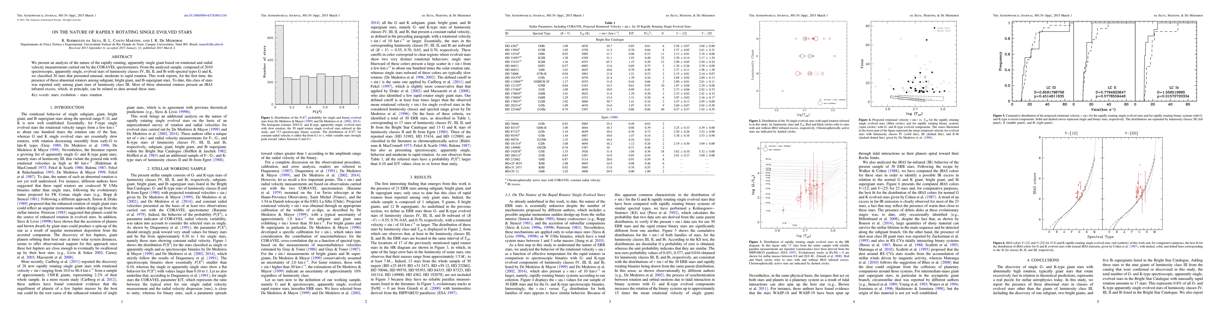 We present an analysis of the nature of the rapidly rotating, apparently single giant based on rotational and radial velocity measurements carried out by the CORAVEL spectrometers. From the analyzed sample, composed of 2010 spectroscopic, apparently single, evolved stars of luminosity classes IV, III, II, and Ib with spectral types G and K, we classified 30 stars that presented unusual, moderate to rapid rotation. This work reports, for the first time, the presence of these abnormal rotators among subgiant, bright giant, and Ib supergiant stars. To date, this class of stars was reported only among giant stars of luminosity class III. Most of these abnormal rotators present an IRAS infrared excess, which, in principle, can be related to dust around these stars.