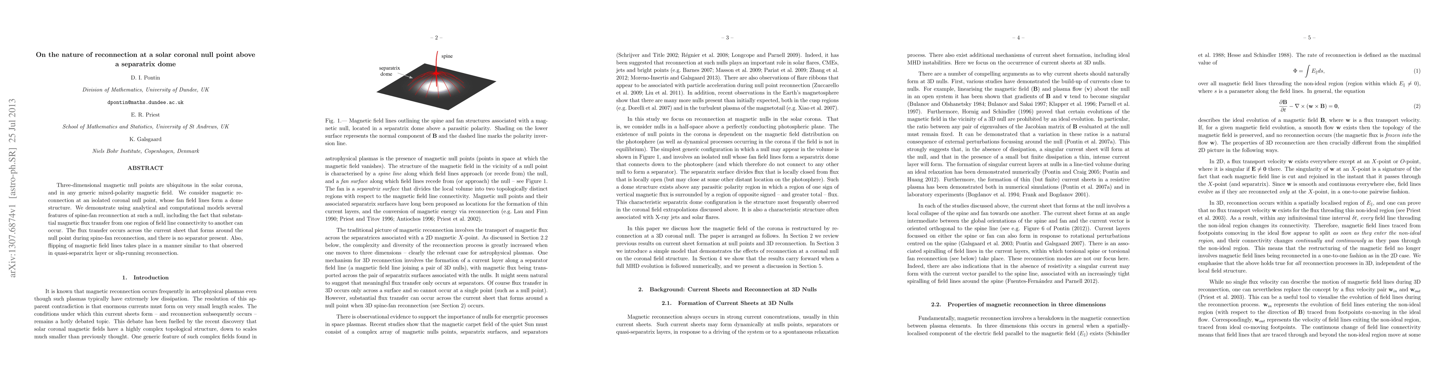 This paper investigates magnetic reconnection at a solar coronal null point above a separatrix dome, demonstrating substantial flux transfer across the current sheet without a separator. Analytical and computational models reveal spine-fan reconnection features, including field line flipping akin to quasi-separatrix layer reconnection.