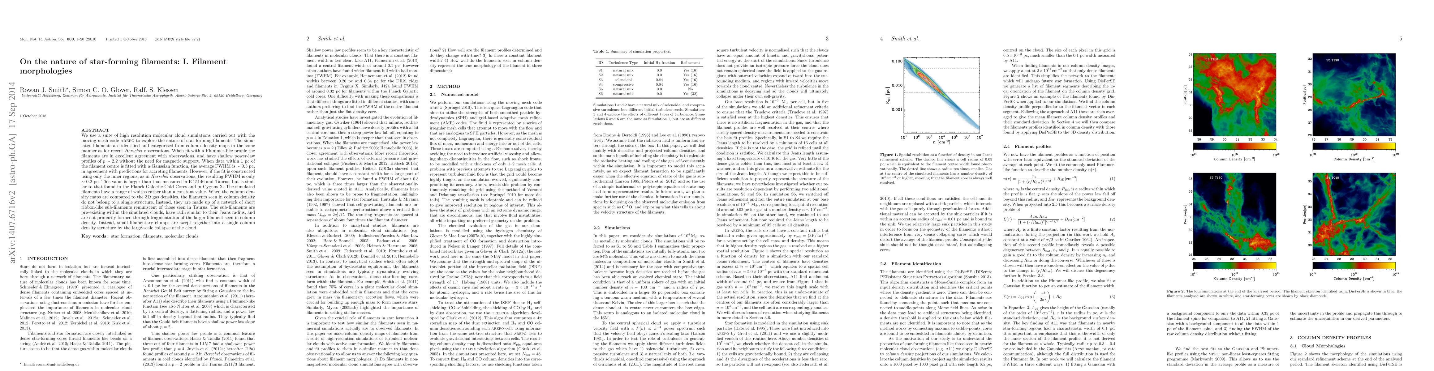 We use a suite of high resolution molecular cloud simulations carried out with the moving mesh code Arepo to explore the nature of star-forming filaments. The simulated filaments are identified and categorised from column density maps in the same manner as for recent Herschel observations. When fit with a Plummer-like profile the filaments are in excellent agreement with observations, and have shallow power-law profiles of p~2.2 without the need for magnetic support. When data within 1 pc of the filament centre is fitted with a Gaussian function, the average FWHM is ~0.3 pc, in agreement with predictions for accreting filaments. However, if the fit is constructed using only the inner regions, as in Herschel observations, the resulting FWHM is only ~0.2 pc. This value is larger than that measured in IC 5146 and Taurus, but is similar to that found in the Planck Galactic Cold Cores and in Cygnus X. The simulated filaments have a range of widths rather than a constant value. When the column density maps are compared to the 3D gas densities, the filaments seen in column density do not belong to a single structure. Instead, they are made up of a network of short ribbon-like sub-filaments reminiscent of those seen in Taurus. The sub-filaments are pre-existing within the simulated clouds, have radii similar to their Jeans radius, and are not primarily formed through fragmentation of the larger filament seen in column density. Instead, small filamentary clumps are swept together into a single column density structure by the large-scale collapse of the cloud.
